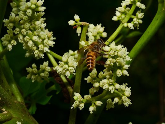 山刈葉的花則剛剛進入盛開期,花雖小但花序卻很壯觀,招蜂引蝶的能力更勝其他植物。 |