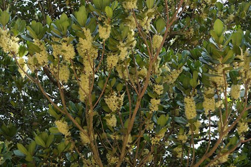 院區有不少棵大葉山欖樹正在同步開花。花蜜和花粉都很多,是昆蟲在冬天裡很好的食物來源。果實成熟期是在夜間觀賞白鼻心和大赤鼯鼠最好的時機。嚐過牠們吃剩的果實,很甜沒有酸味。院區的狗在樹的附近咬死過白鼻心。生態時代館二樓的展出中有物證照片。大而密的葉子也讓這些樹成為院區的領角鴞在白天休息的地方。