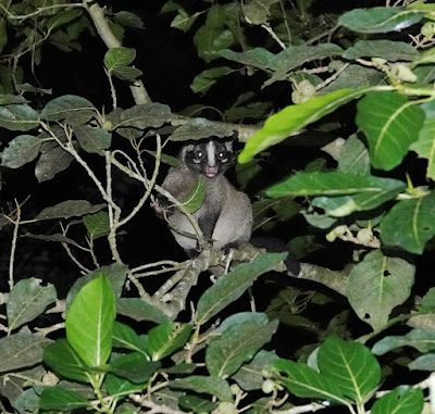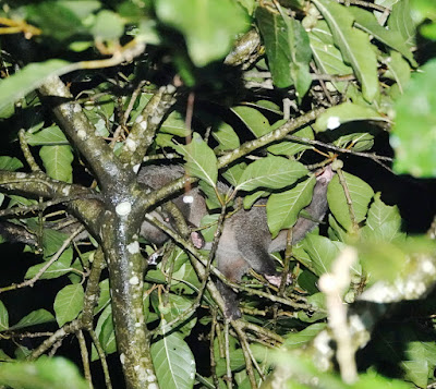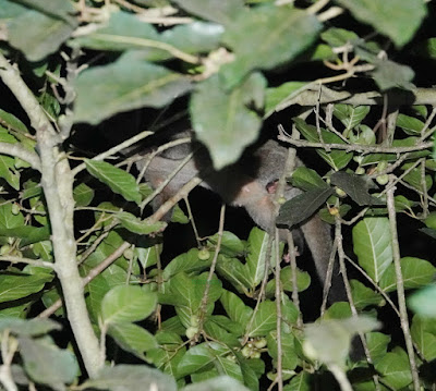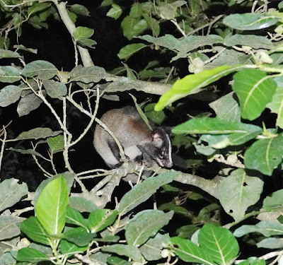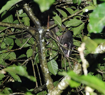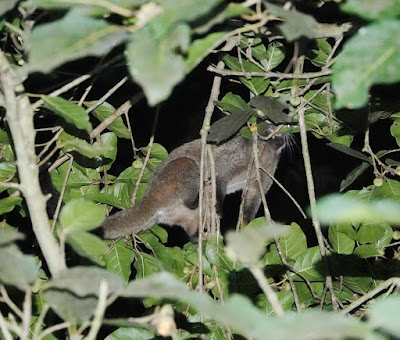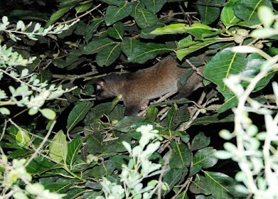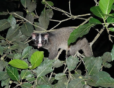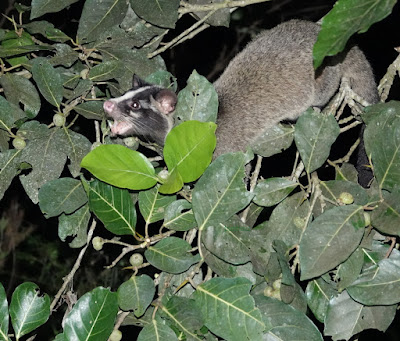 10月01日夜晚,有四位想看看白鼻心的志工夥伴們也來到稜果榕附近,天黑之後,白鼻心準時出現在樹枝間覓食,我們同時看到有兩隻白鼻心在樹上。但我們過於急切的想拍牠,牠們顯得不安,很快就從樹枝上跳走了。雖然後來還是有回來取食,但停留時間都不長,我們考慮到會影響牠們的覓食,大家就解散了。10月04日晚上,我和另一位志工朋友再次探訪白鼻心,當晚天候不佳,天空下著雨,且雨勢頗大。白鼻心還是準時出現在稜果榕樹上。但牠對於我們兩人的出現也是很不安,只要我們的燈光照到牠,牠就直接從樹稍滑落到地面。就算我們沒有打燈的在黑暗中站了二十分鐘,牠也仍然不再現身。同行的夥伴說有聞到白鼻心的體味,我嗅覺不好,沒有感覺到味道。或許牠的視覺好,能看到我們站在樹旁,或是也能聞到我們人類的體味。