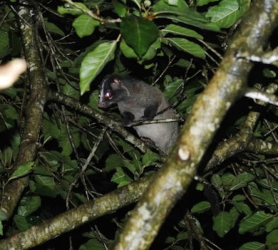 當我第二次靠近稜果榕時,我看到靠山那邊的樹稍有大型動物在搖晃。當下我心中有些害怕,但我還是想看清楚讓樹枝搖晃的主角是誰?那搖晃由遠慢慢靠近時,我看見那動物的臉有一道白毛,哇!應該是「白鼻心」,我沒看過白鼻心,牠對我來說,一直都是書本及標本室裡的動物,我對牠的了解非常的貧乏。牠在樹枝間搖搖晃晃,以口取食,牠是來吃稜果榕熟果的。牠視乎不在意我的存在,一路往我這邊過來,甚至還全身站在枝條上與我對看(相隔不到3公尺),相當好奇的看著我。幾秒後才轉身往後方去。我也趕緊關掉手電筒,轉身往門口去,我怕干擾牠的覓食。隔了幾分鐘,我再次走進九米道路,白鼻心還在樹上繼續牠的晚餐,絲毫不受我出現的影響。等到牠吃飽了,從樹幹上走下來,我才開心的返家,結束今晚的奇遇。我與白鼻心的第一次邂逅。