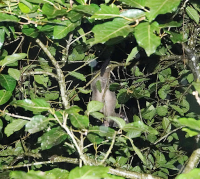 隔天傍晚,天空仍然下著雨,我仍對白鼻心充滿念想,我想知道如果只有我一人,牠是否能像第一天一樣的接受我的存在。當我到達稜果榕樹旁時,牠馬上知道我的存在,我還聽到牠發出警戒聲,但牠沒有立即離開樹上,而是稍微移動身體, 想與我保持一個安全距離(相隔約六公尺),不像第一天那樣的全身站在我面前。在我觀察的那段時間(接近一小時),牠都在樹上持續牠的覓食行為,因為我偶而會打燈看看牠是否還在,直到牠吃飽離開了,我才結束雨天夜晚的觀察活動。