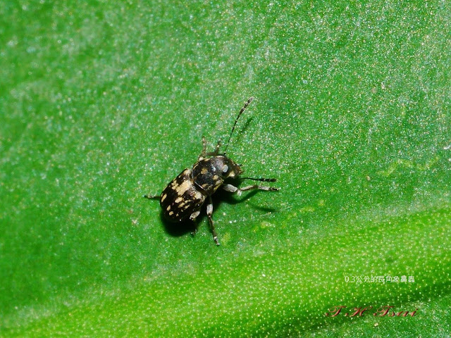 超小0.3公分的長角象鼻蟲在葉上快走,頭上的兩根棍棒似乎是在發射電報,我的同伴在哪裡啊? |