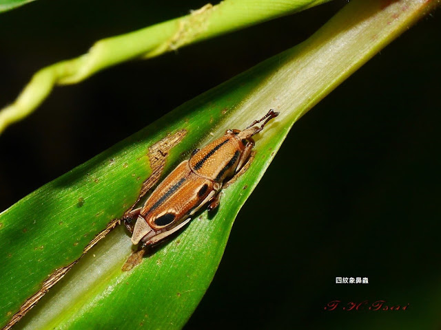 四紋象鼻蟲剛從捲曲的月桃葉中鑽出,窩在葉鞘的地方躲避天敵。 |