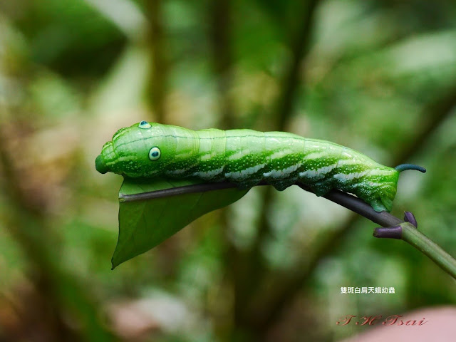 世仁亭附近,雙斑白肩天蛾幼蟲正在大啖樺八仙嫩葉。 |