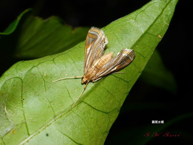 圓斑水螟躲在樺八仙葉下,逃不了我的法眼,誰叫你的翅膀色澤如此的燦爛奪目! |