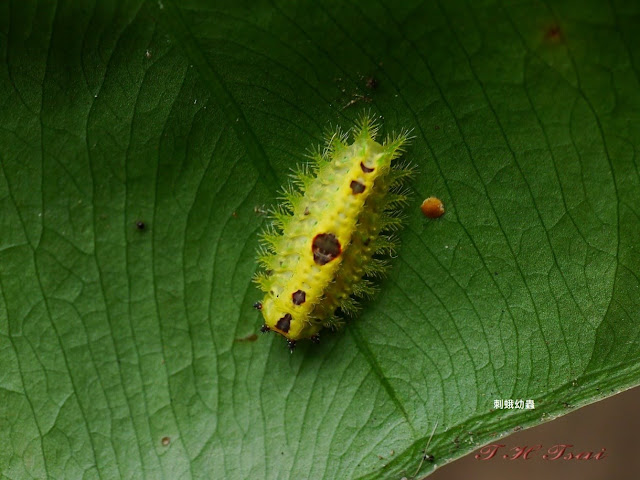 鮮黃色的刺蛾幼蟲在葉上慢行,模樣像極了外太空的飛行船。 |