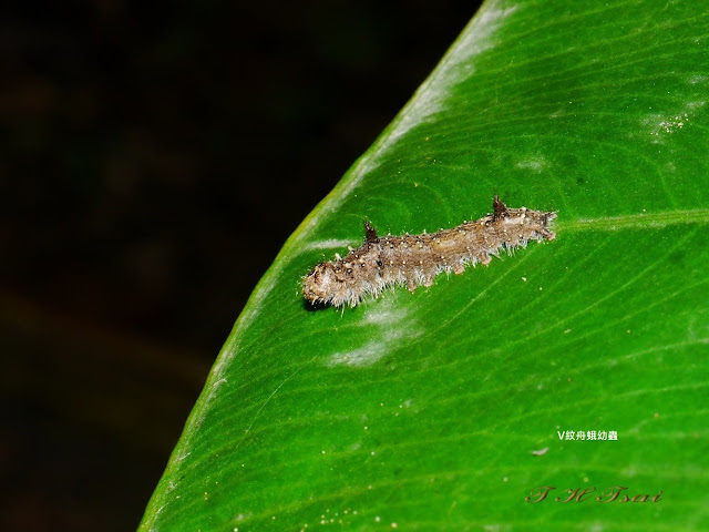 V紋舟蛾幼蟲也出現在葉面爬行。 |
