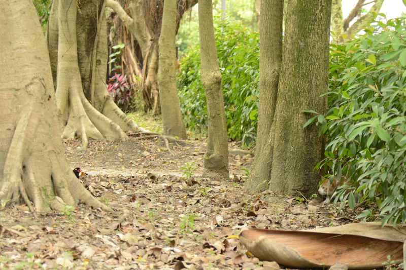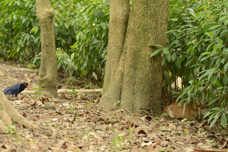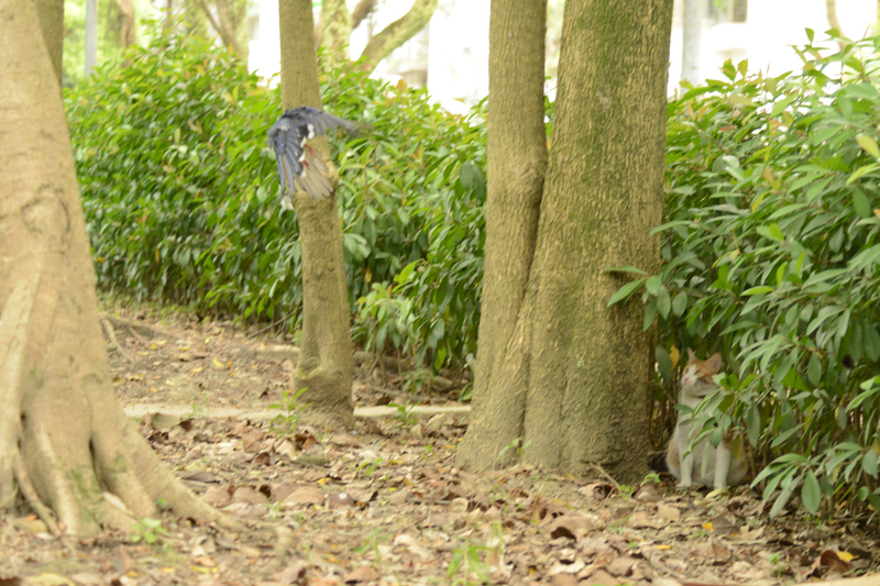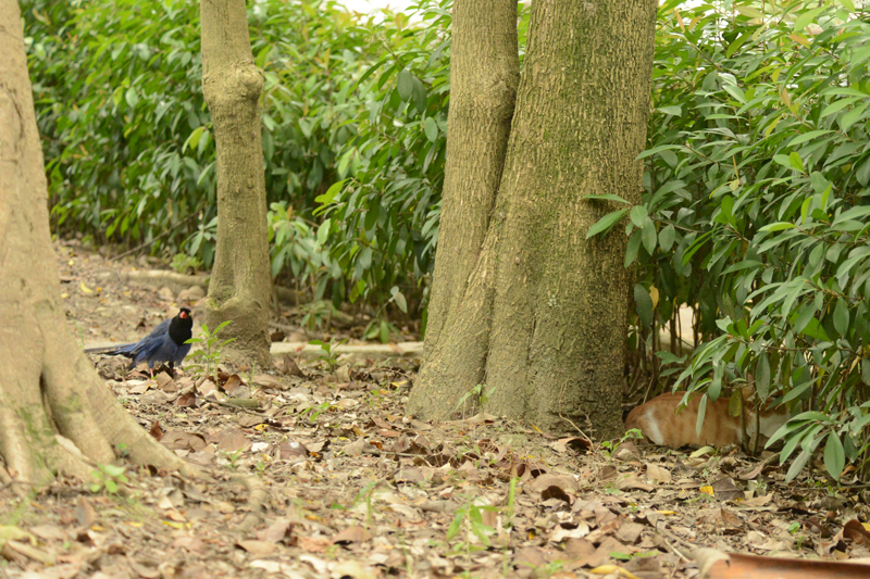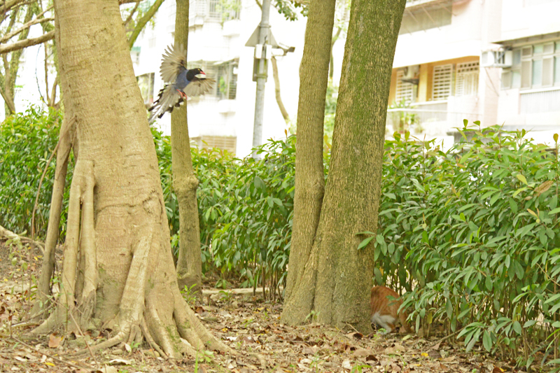 一隻台灣藍鵲下地準備攻擊黃貓安東。 |