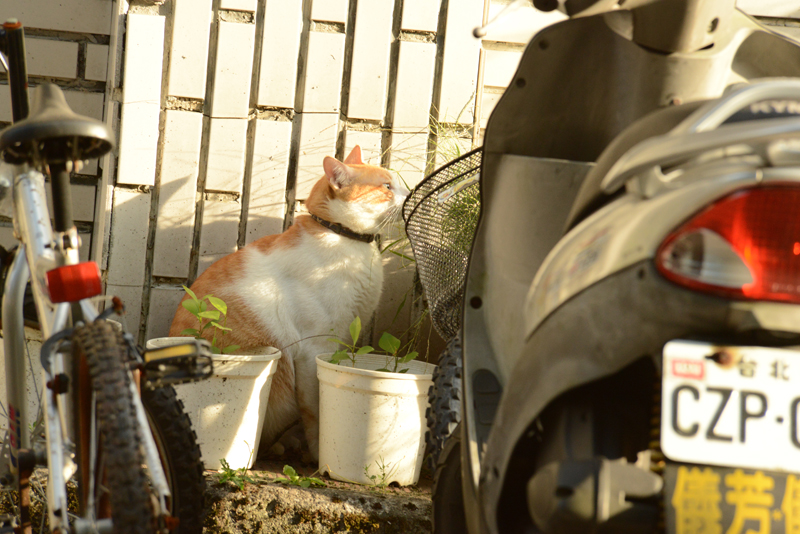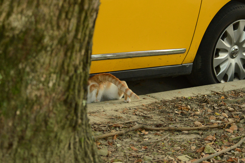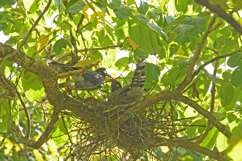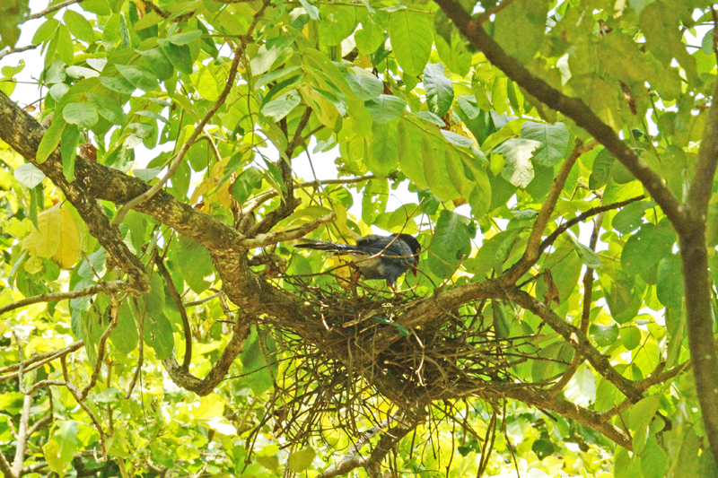 這一天,雖然見到台灣藍鵲偶爾會站上巢,但是不確定巢中是否有卵或小鳥。巢由小樹枝構成,夾帶著一個綠色衣架。巢外還有另一個衣架掛在樹上。這個家族成員很少,只有三隻成鳥。兩隻較大的體型和尾羽大小都比不上中研院那群的高階成員,另外一隻的角色像是跟班,常負責留守的角色,尾羽也更細小。 中午一點時,看到其中一隻帶回食物獨享,並沒有和其他夥伴互動或飛上巢餵食的行為,照相後細看出嘴上的是隻盤古蟾蜍。 下午五點多,聽到家門口傳來台灣藍鵲的叫聲,只見牠站在機車的後視鏡上向下方示威,還進一步跳下去挑釁,但是機車擋住了牠的示威對象。等這波敵意行為過後,我繞過去看到了退縮在一角的受害者,原來是隔壁鄰居養的黃貓安東。在隨後第二波示威後,安東趕緊躲入車下。約十五分鐘後,看到下一個受害者。藍鵲由四分溪對岸帶回一隻即將或剛離巢的五色鳥,在樹上獨享。