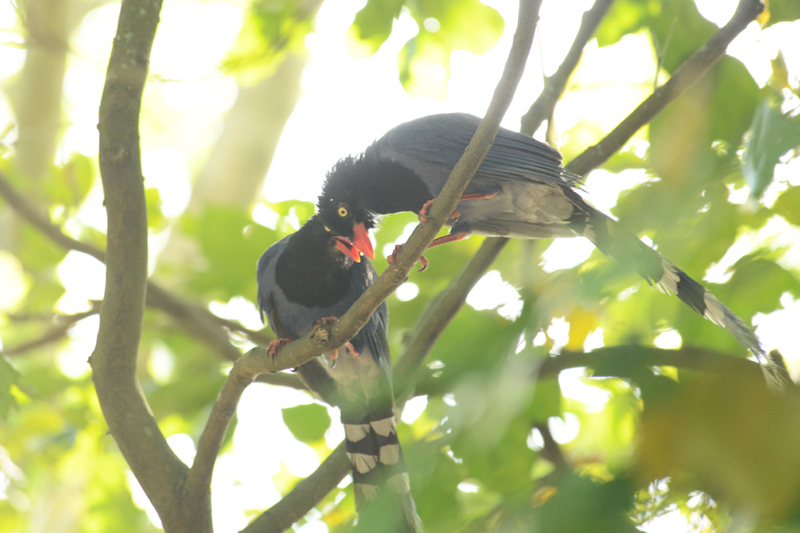 小藍鵲已經孵出,大鳥的攻擊性也更強。因為雛鳥還無法將頭露出巢上,大鳥上巢的時間也很短,一直到用電腦螢幕放大照片,才發現小藍鵲已經孵出。早上七點多,看到藍鵲爸爸先將口中的蟲分一些給藍鵲媽媽,然後開始餵食。在大鳥嘴下的粉紅色影子就是雛鳥,需要大家用點想像力。常常可看到親鳥恩愛的畫面。