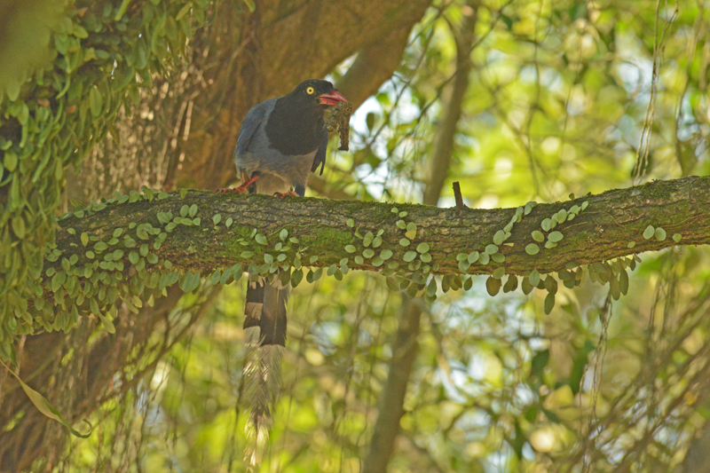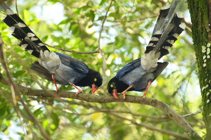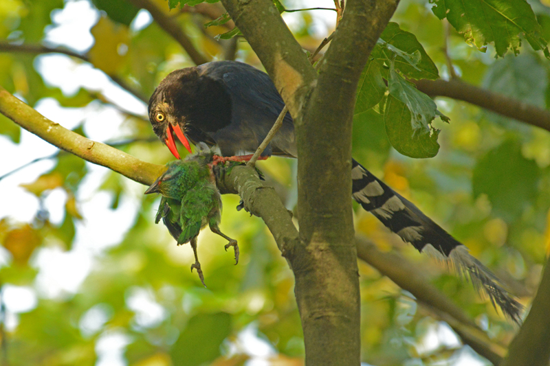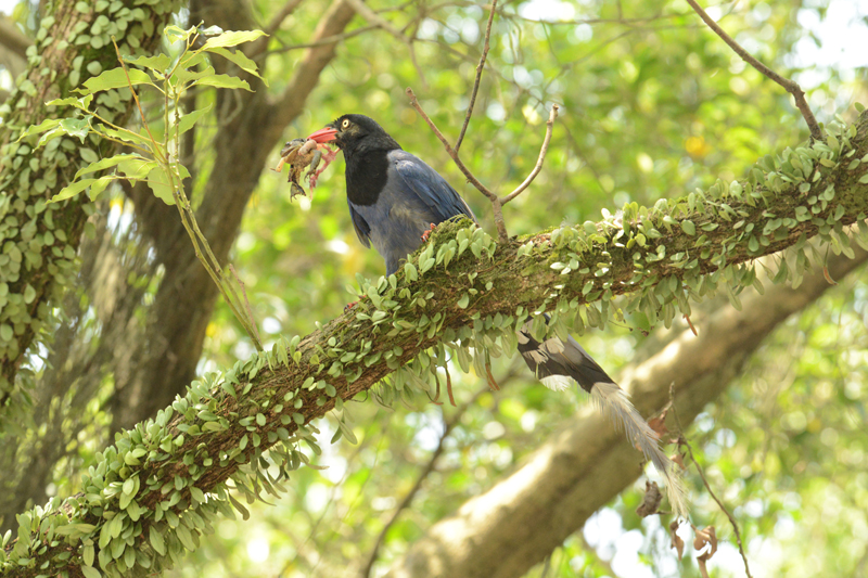 台灣藍鵲帶回一隻五色鳥,正要享用。 |