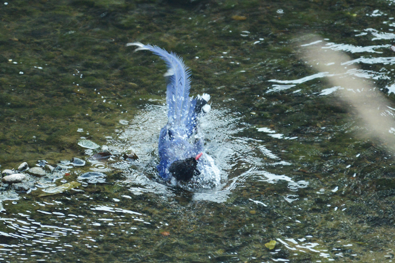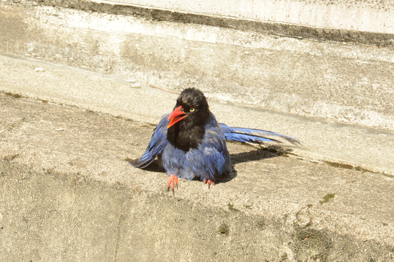 台灣藍鵲在公園旁的四分溪洗澡 |