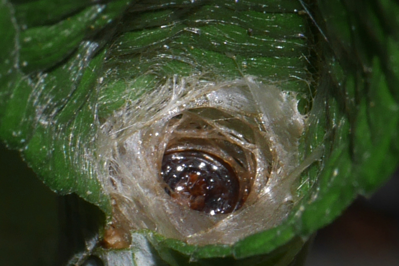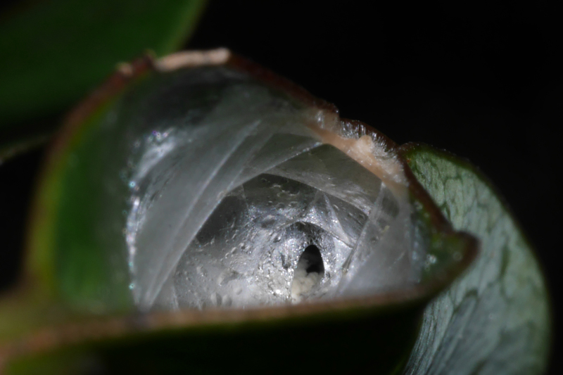第二天蟲巢口已經出現幾層像緞帶的牆,第三天去看時已經更美更精緻,架構和L紋鉤蛾的巢類似但是還沒有完成,在正面也留著一個狹長的開口。蟲巢後端已全部封住,構造不如前端精緻,已經不見尾部露出。三天後再去觀察這個蟲巢,在洞口內部看到疑似小繭蜂的白繭。說不定是小繭蜂的傷害讓牠選擇較小的葉來節省能量,但是還是失敗了。