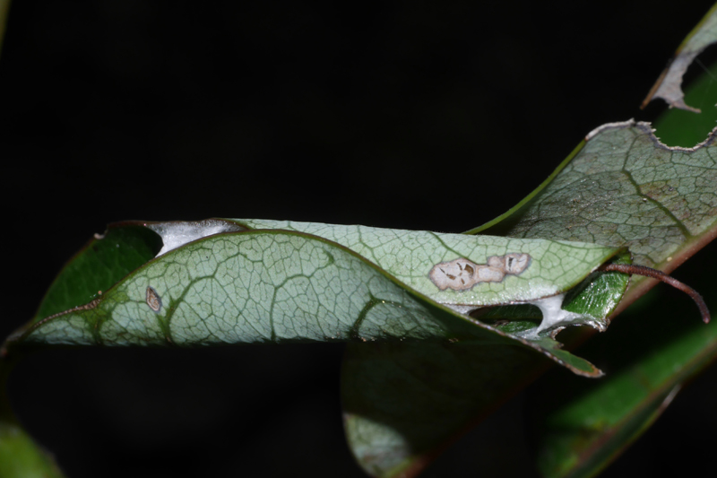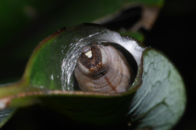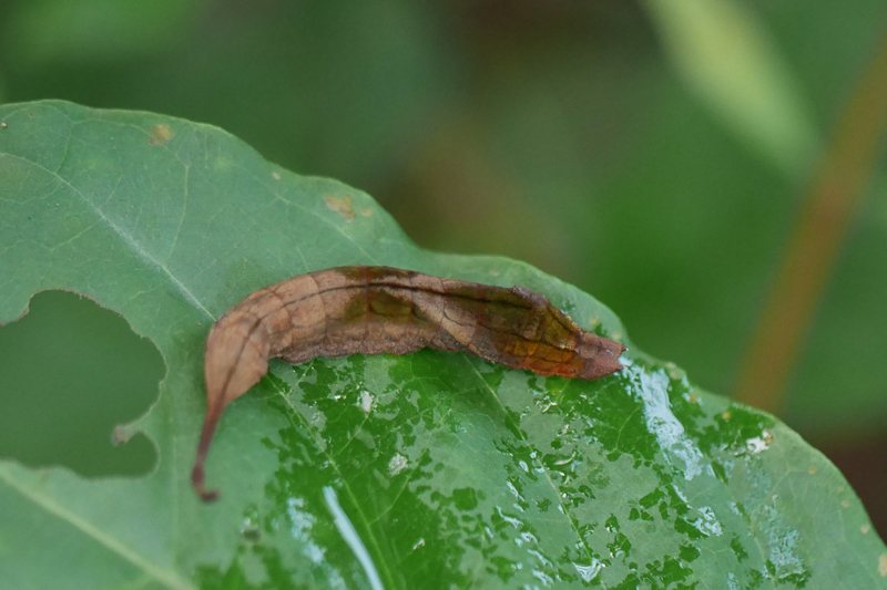 波帶鉤蛾的幼蟲出現在虎皮楠上,在拍照時發現已經有一隻捲好葉子開始築巢。不知是不是偷懶省力氣,選的葉子曾被啃過只剩一半長度,築巢時像葉柄的尾部還露在外面。