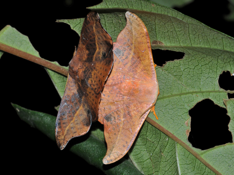 L 紋及波帶鉤蛾不僅在幼蟲階段像捲起的枯葉,在成蟲階段更像展開的枯葉。在我們步道上能夠同時遇上兩種幼蟲已經是很大的福氣,能觀察到牠們築巢更是難得的經驗。德輝之前已經報導過近日出現的幼蟲,沒見他繼續報導就由我來接棒。