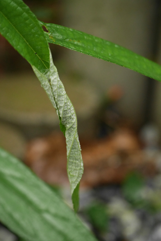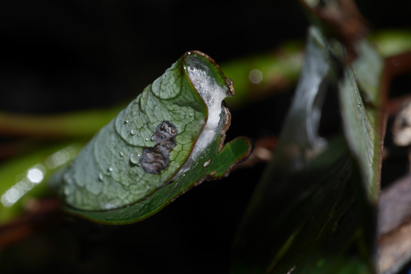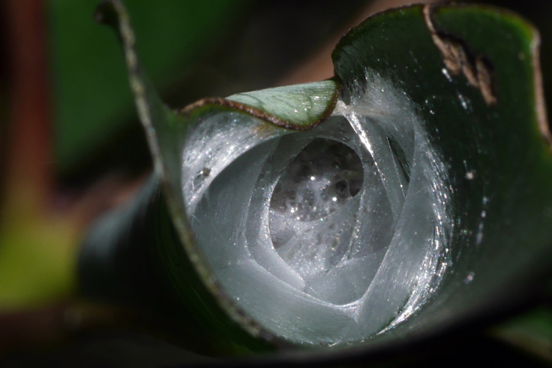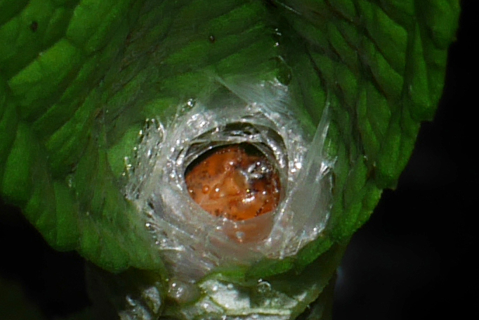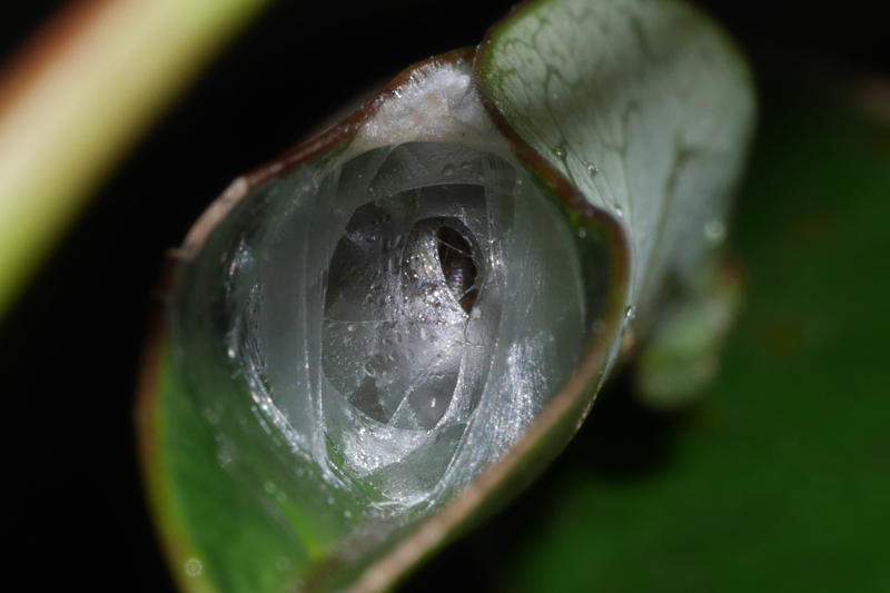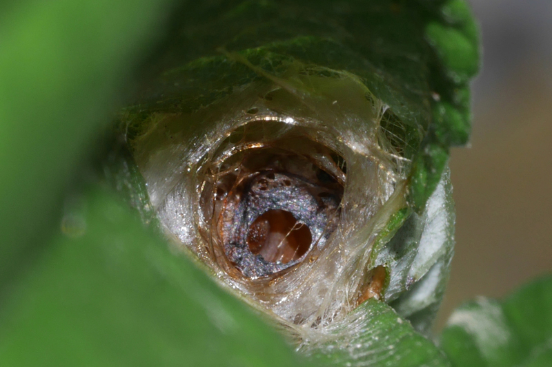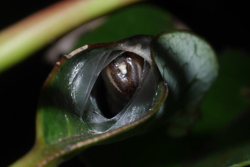 明知牠當晚就會利用水麻葉築巢,但是因為有毛毛細雨打消了熬夜追蹤的念頭。也幸好如此,否則沒睡不打緊,用光電池和記憶卡也照不全。第二天中午雨停上步道時,水麻葉子已經捲起,入口處築起幾道美不勝收的絲牆。每一道牆至少要來回幾百遍才能完成。在捲起蟲巢的葉柄附近,幼蟲已經吐絲做了些保險的措施,萬一葉子枯委也不會掉落。之後幾天持續觀察,不確定為什麼繼續留一個大的洞口,不容易觀察到內部是不是正常。