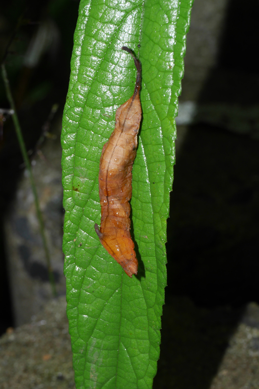 通常都是在水金京上看到L紋鉤蛾的幼蟲,追蹤的這隻先是在台北玉葉金花上,再移到隔壁的水金京上,最後在築巢前搬到了十幾公尺外的水麻葉上。
