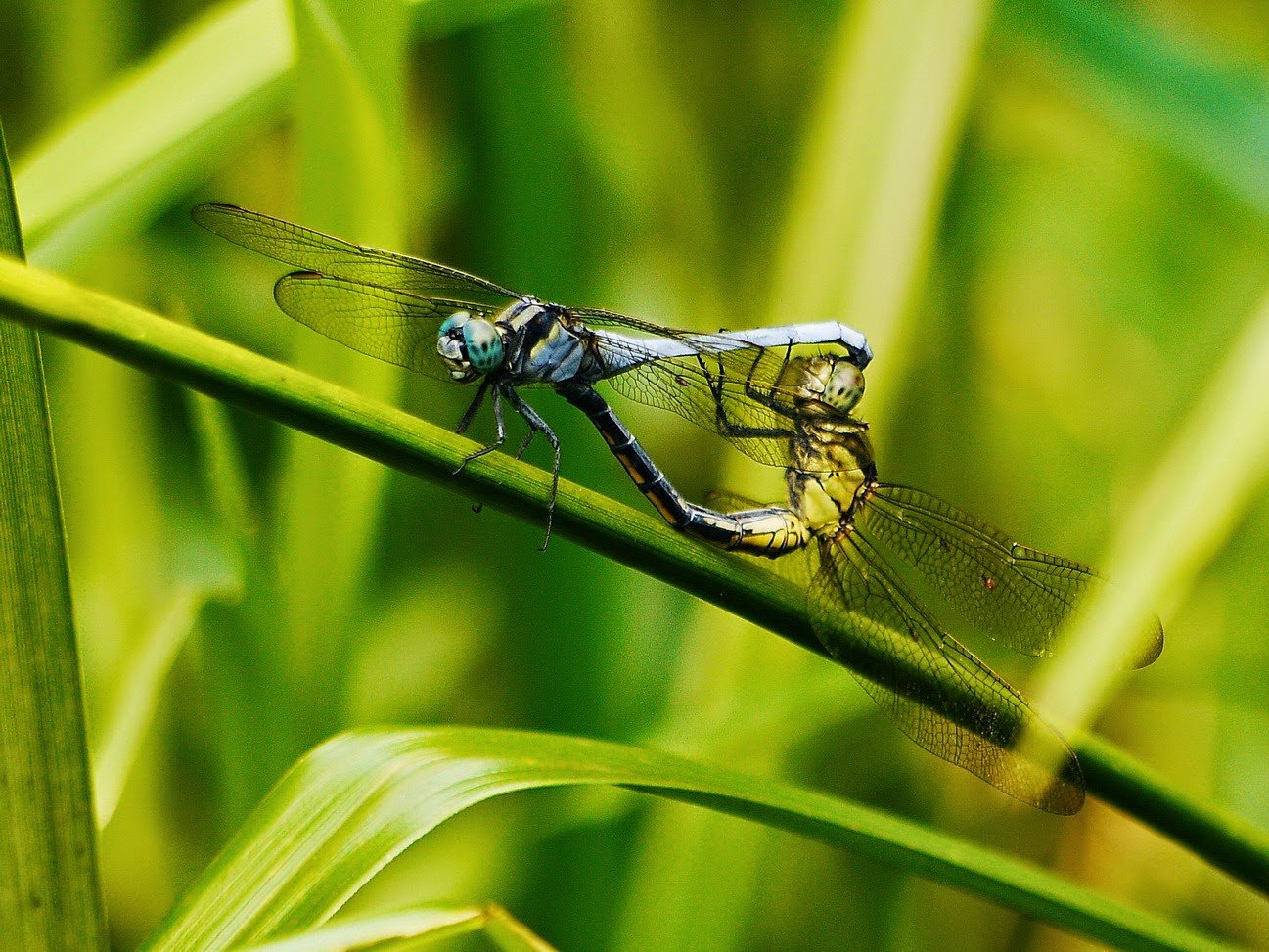 呂宋蜻蜓 身長近5公分,雌和雄不同色,常見於生態池,上雄下雌,典型的心形結合交尾。 |