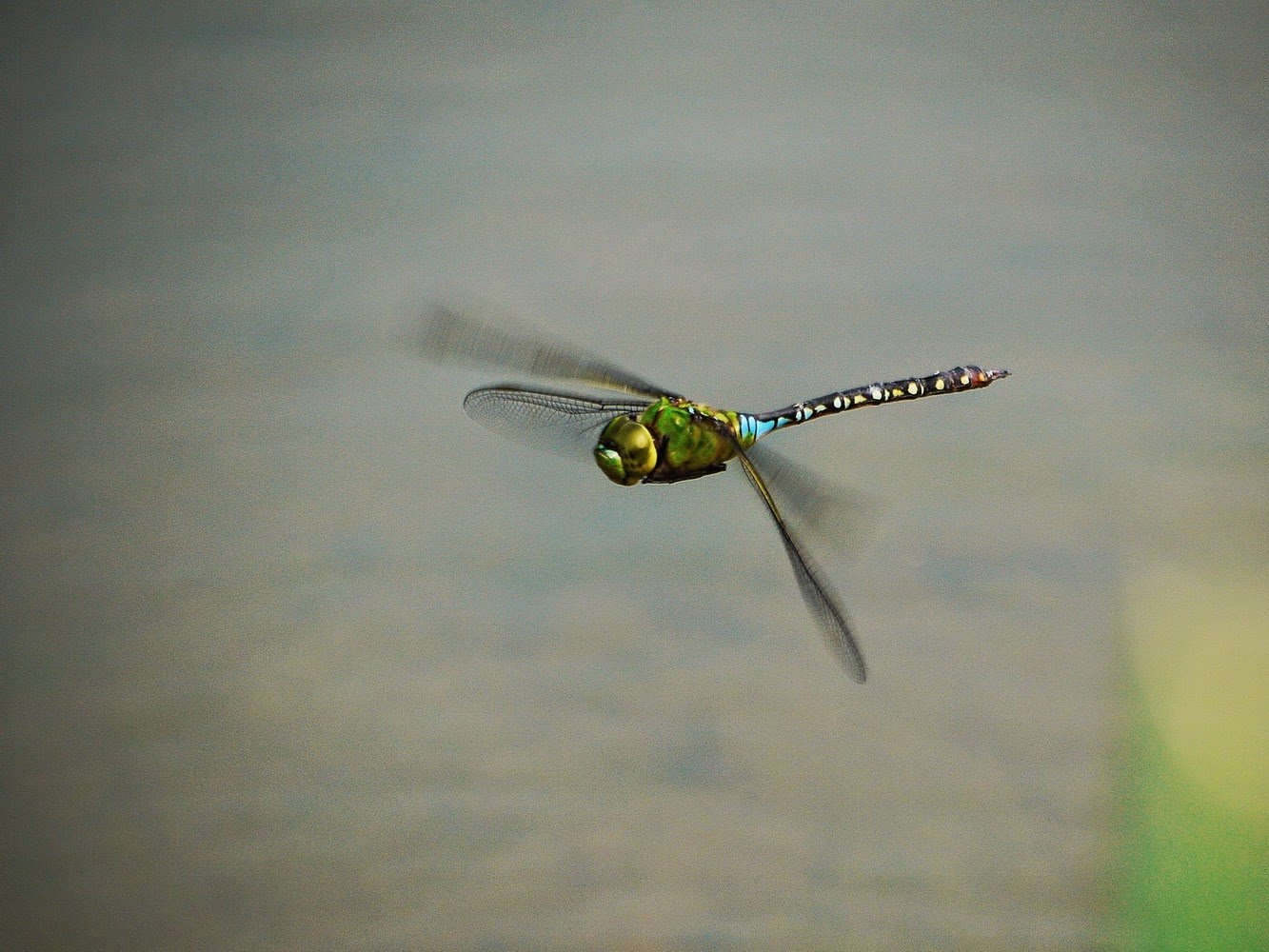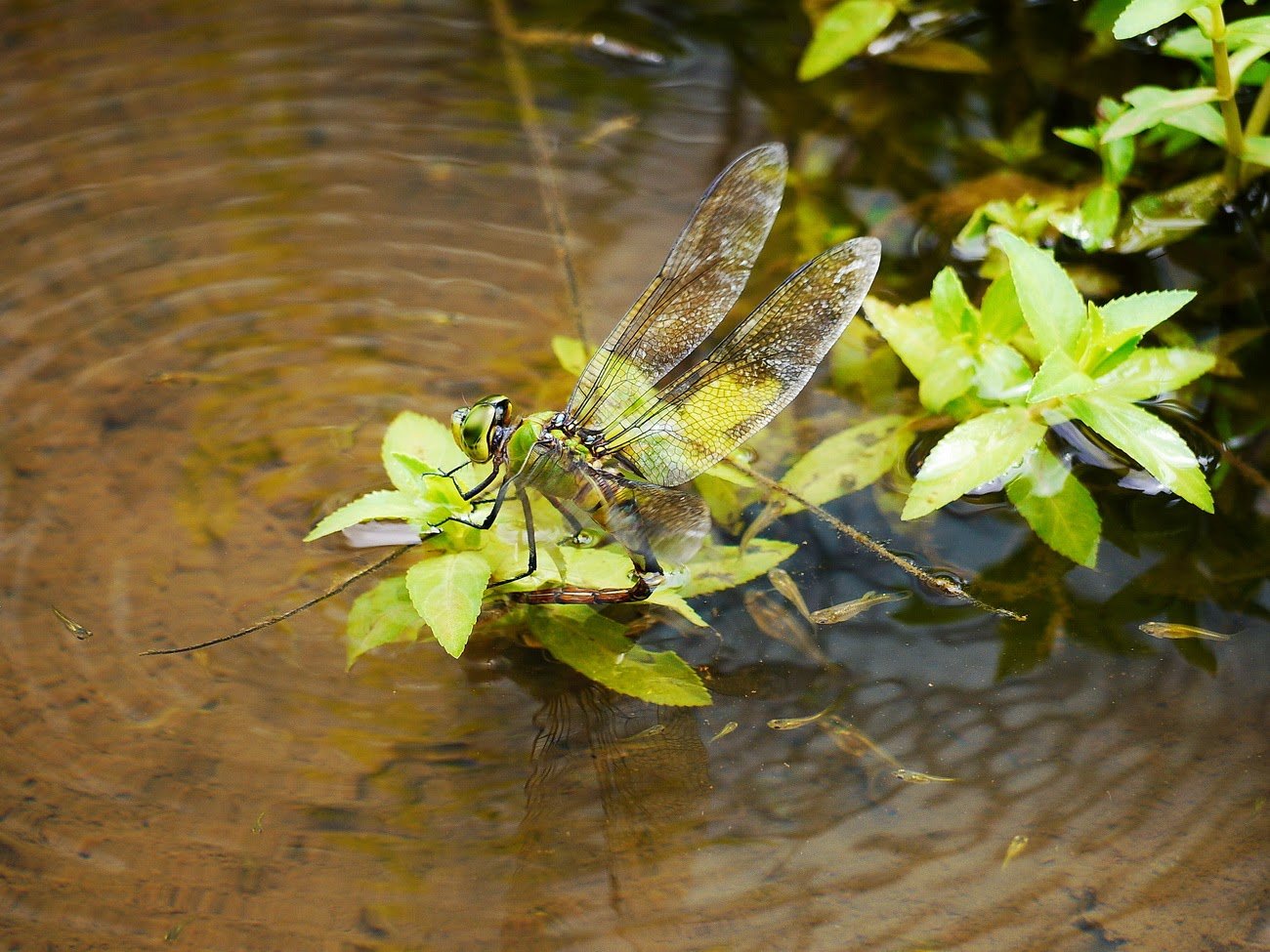 麻斑晏蜓產卵 身長約8.5公分,產卵於水下植物上,小魚常會爭搶卵粒,大快朵頤。飛行速度超快而不規律,經常急轉彎甚少停棲,有時會停於半空中。 |