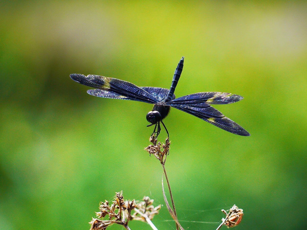 藍黑蜻蜓 身長約3.5公分,雌雄同色,但雌蟲翅尖透明無色,喜停於池邊獨立枝條。 |