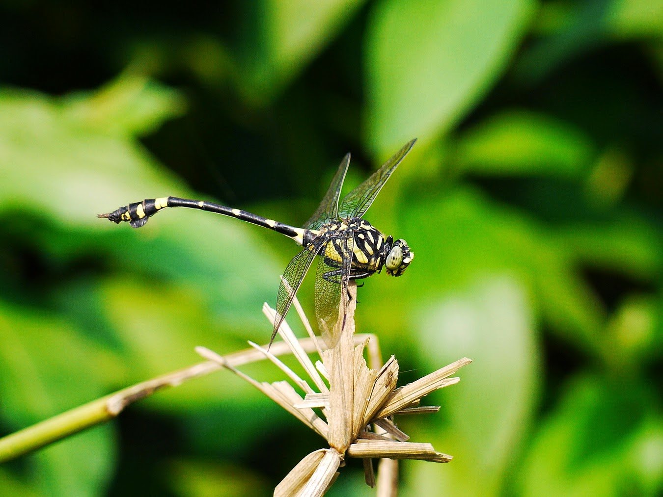 粗鈎春蜓 身長約7公分,常停棲於岸邊枯枝,伺機捕捉獵物也捕捉其他蜻蜓,接近尾部的黑色半圓形突起是辨識依據。 |
