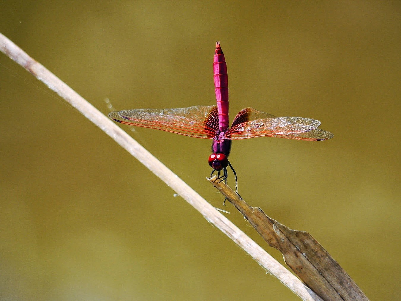 紫紅蜻蜓(雌) 身長約3.8公分,雌雄異色,水邊常見的蜻蜓,停棲時腹部常垂直上舉。 |