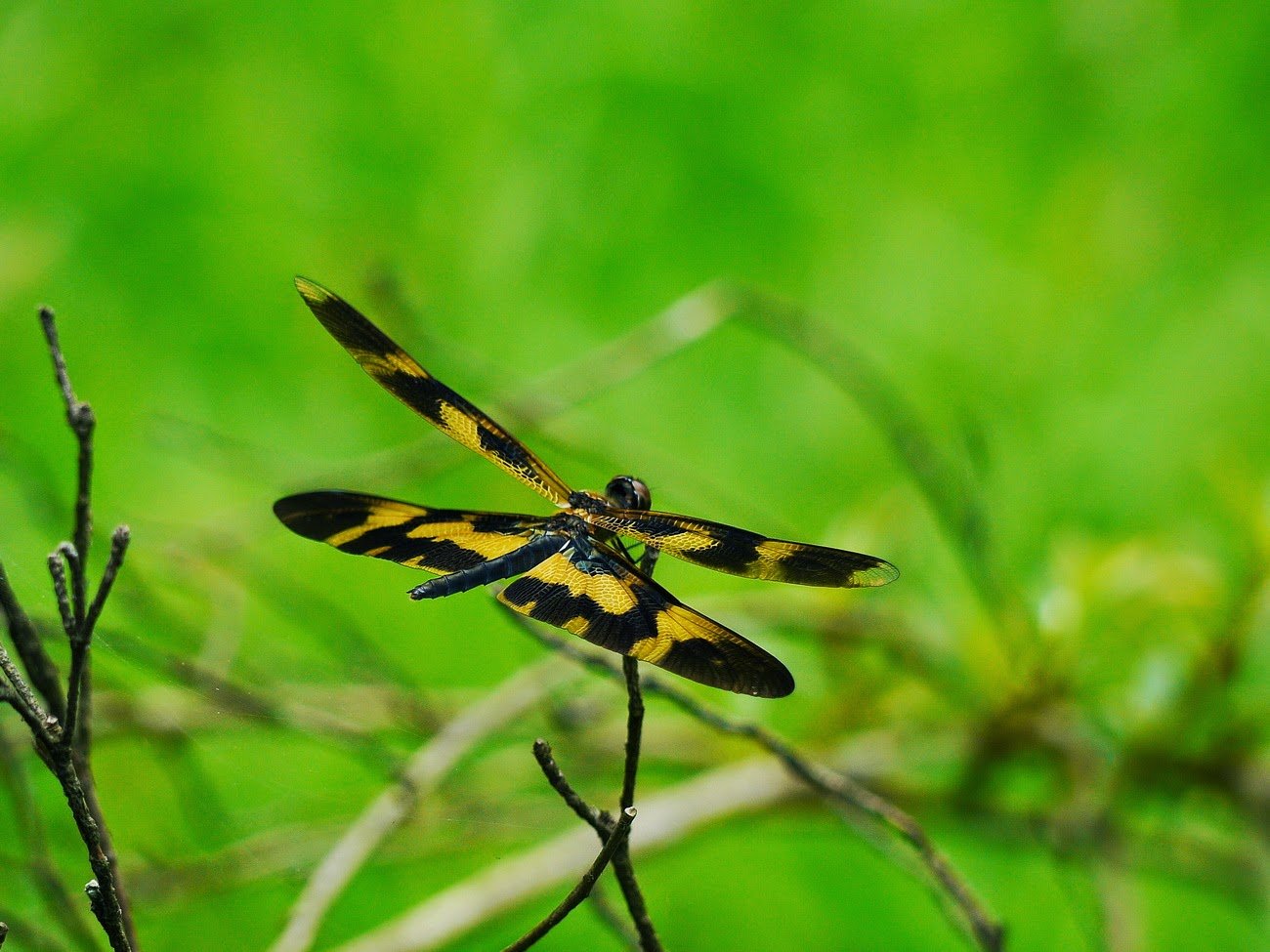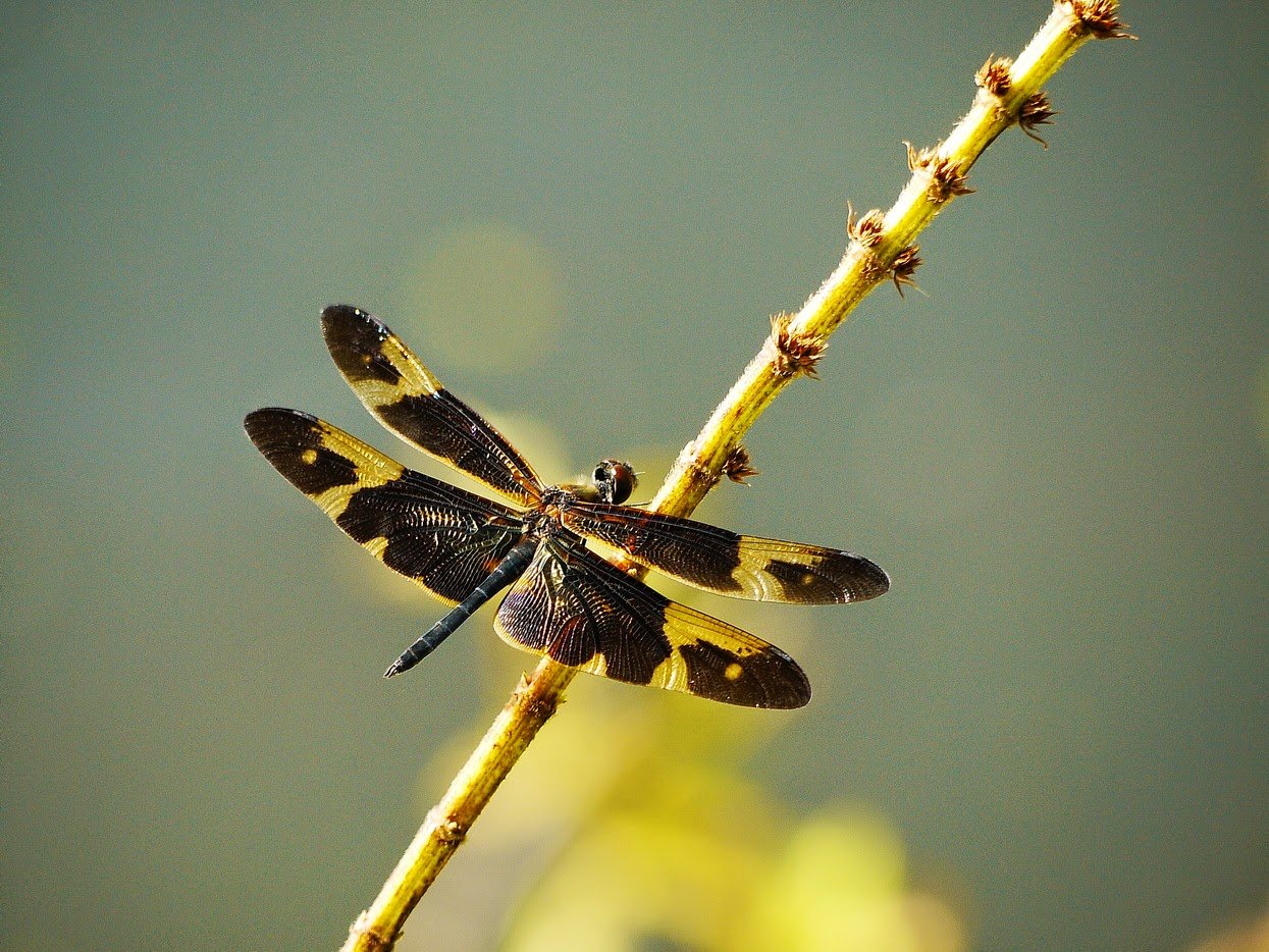 彩裳蜻蜓 身長約3.7公分,翅黃色有不規則黑斑,黑斑大小和分佈有個體差異,雌蟲前翅尖,透明無色。飛行緩慢似蝴蝶,有蝴蝶蜻蜓之稱。 |