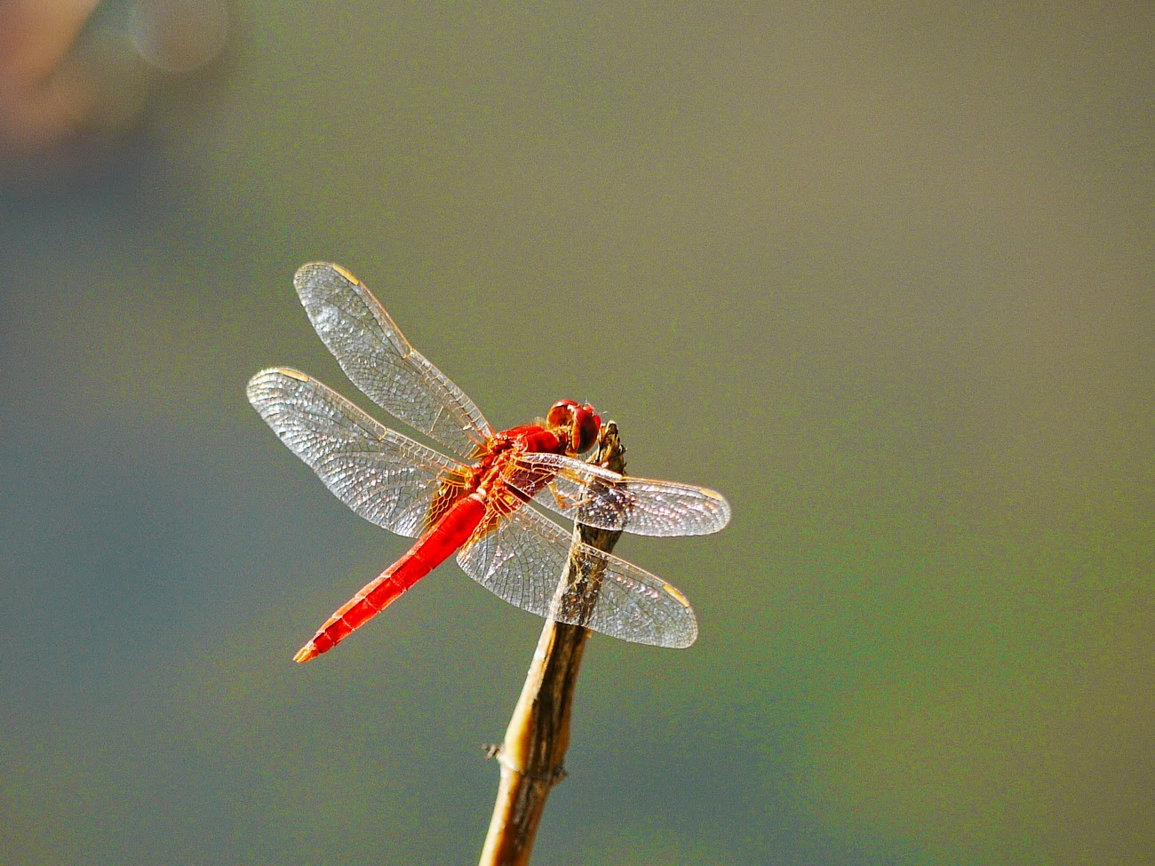 猩紅蜻蜓 身長約4公分,雌雄異色,雄蟲全身艷紅。常見於池邊枝條上停棲。 |