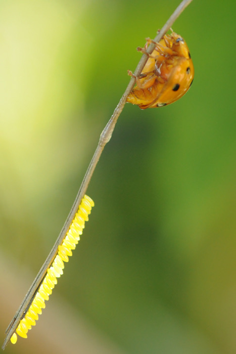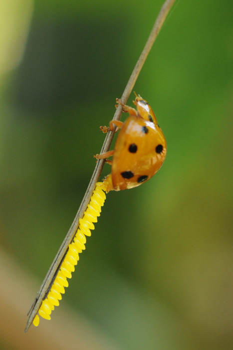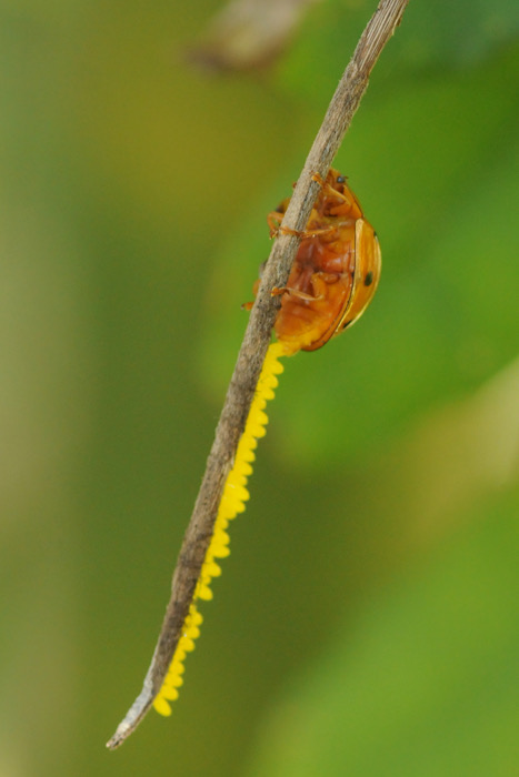 十斑大瓢蟲在枯藤折斷端開始產卵 |