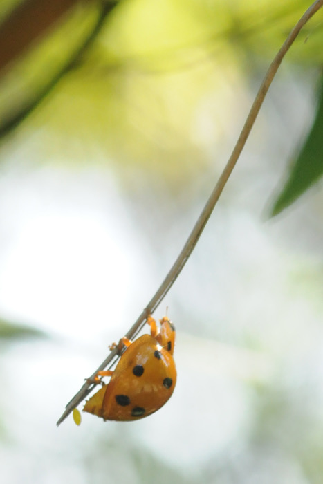 約十分鐘後,在過山龍旁的細小枯藤上出現了一隻,上上下下一陣子後,在枯藤斷掉懸空那端停了下來。幾分鐘後,出現了一粒金黃色的卵,心情又振奮起來。風很大,但是瓢蟲產卵沒受到枯藤飄動的影響,相機設在手動對焦卻是困難重重。產卵完後,看到瓢蟲在離卵幾公分的地方繞著藤轉圈,好像是在以鋼管舞來慶賀好心情。一陣子後,在轉圈處出現了一層黏膠,原來是瓢蟲一圈又一圈的在分泌膠質。要佩服產卵過程的複雜設計,由枯藤懸空端開始產卵然後在另一端塗膠就可避免螞蟻在卵硬化前過去吃卵,懸空那端是不會出現螞蟻的。