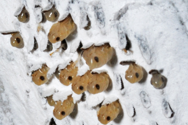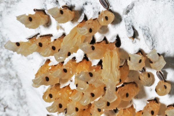 在5點53分時,開始有若蟲移出,在離開卵列不遠的地方停下。6點42分左右,大部分若蟲都已移出卵列,顏色較深、形狀也大致穩定下來。這時先到步道上整理竹子,8點55分於回程中再去看時,顏色已經接近黑色,反應也很快。是照相角度讓牠們顯得很不健康,德輝相機一湊過去全體動了起來。為了讓大家看得更清楚一些,放大了局部畫面,以下檔案的最後六位數字是時分秒。可先注意接近畫面中間的最大若蟲,在不到一分鐘的時間內,頭部上方長出個包,再拉長變形。讓人想起神鬼傳奇片中木乃伊士兵的帽子,或是亞瑟的奇幻王國片中的魔王馬塔殺。如果花時間注意看其他若蟲,也可以體會牠們怎麼由圓圓只露兩隻可愛眼睛的小精靈模樣在短時間內變化成長。如果有高解析度的攝影機在錄影後,再以五或十倍速撥放出來,就可直接迅速的讓大家體會到這段演變過程有多神奇。