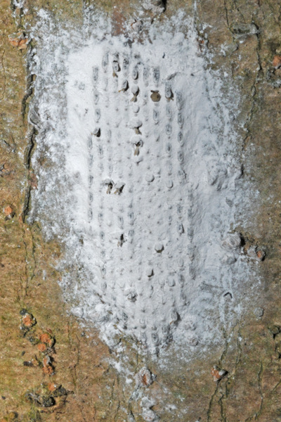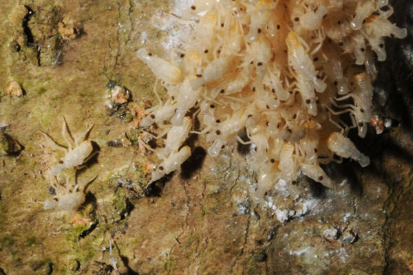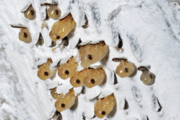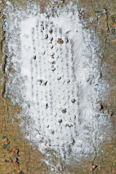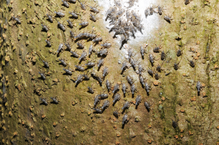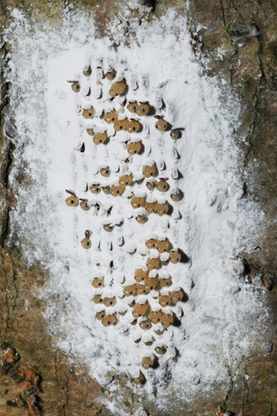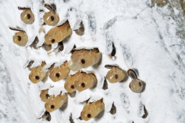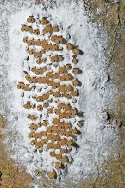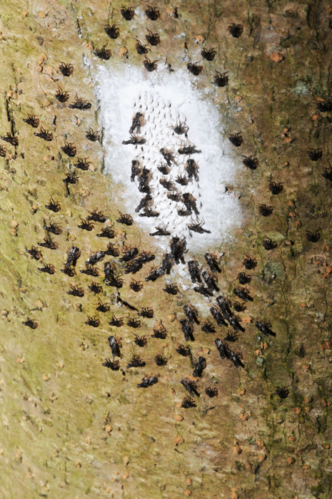 在中研院森林步道約100 M江某樹幹上的渡邊氏東方白蠟蟬卵列有12隻 孵出來,預估剩餘的卵會在第二天清晨孵化。