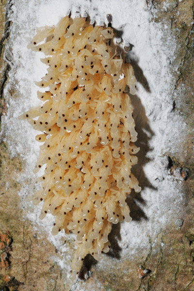 22日天色微亮於5點16分到達現場,5點17分時卵列還沒動靜。相機比我的眼睛銳利,要靠相片幫忙判斷。5點20分再拍時,已經看到一個小頭冒出窗格,有幾扇窗開出小縫。一分鐘後就看到幾個小頭頂開窗子冒出來。5點25分時,孵出的若蟲增加了很多,大部分都在 5點27分前冒了出來。到5點39分時,大部分的若蟲都已經伸展拉長,整個卵列看來像是蠟蟬若蟲組成的台灣島。每隻若蟲比卵都大了十倍以上,牠們是怎麼維持生長的?