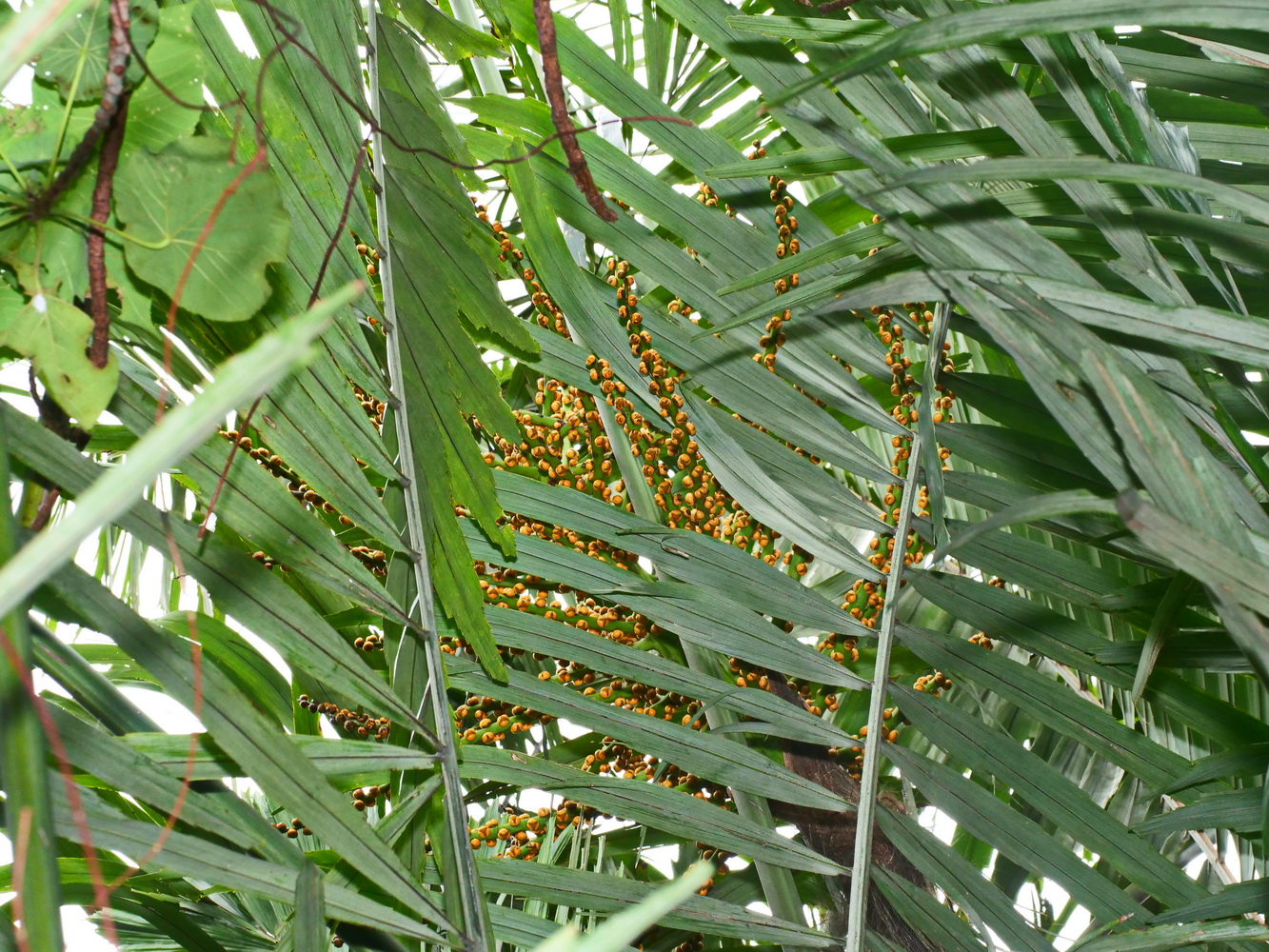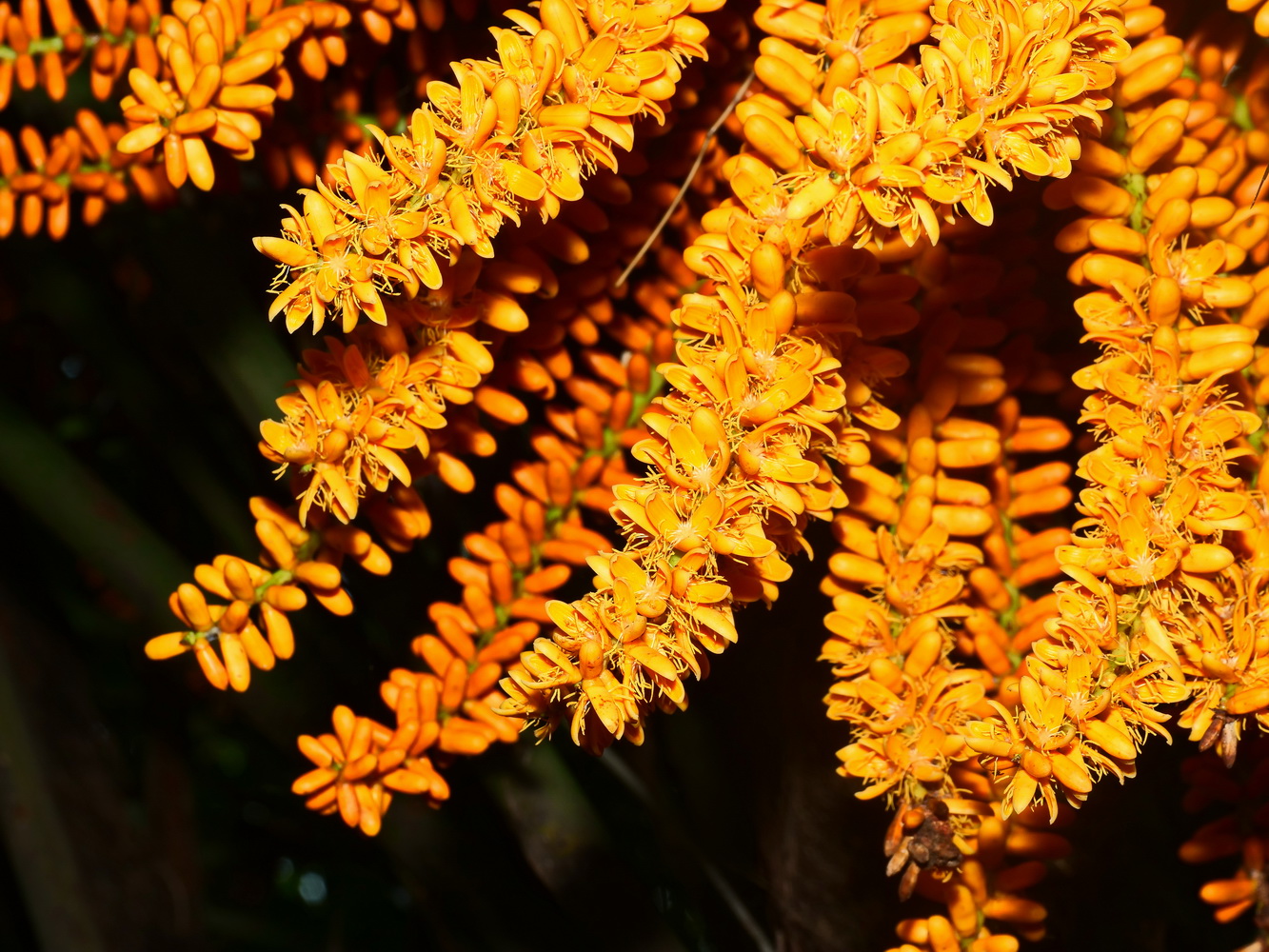 國家生技研究園區的山棕植株龐大高約四公尺,雌花雄花同株開放中,高處開出雌花,低處開雄花,香氣四溢,吸引了很多昆蟲.