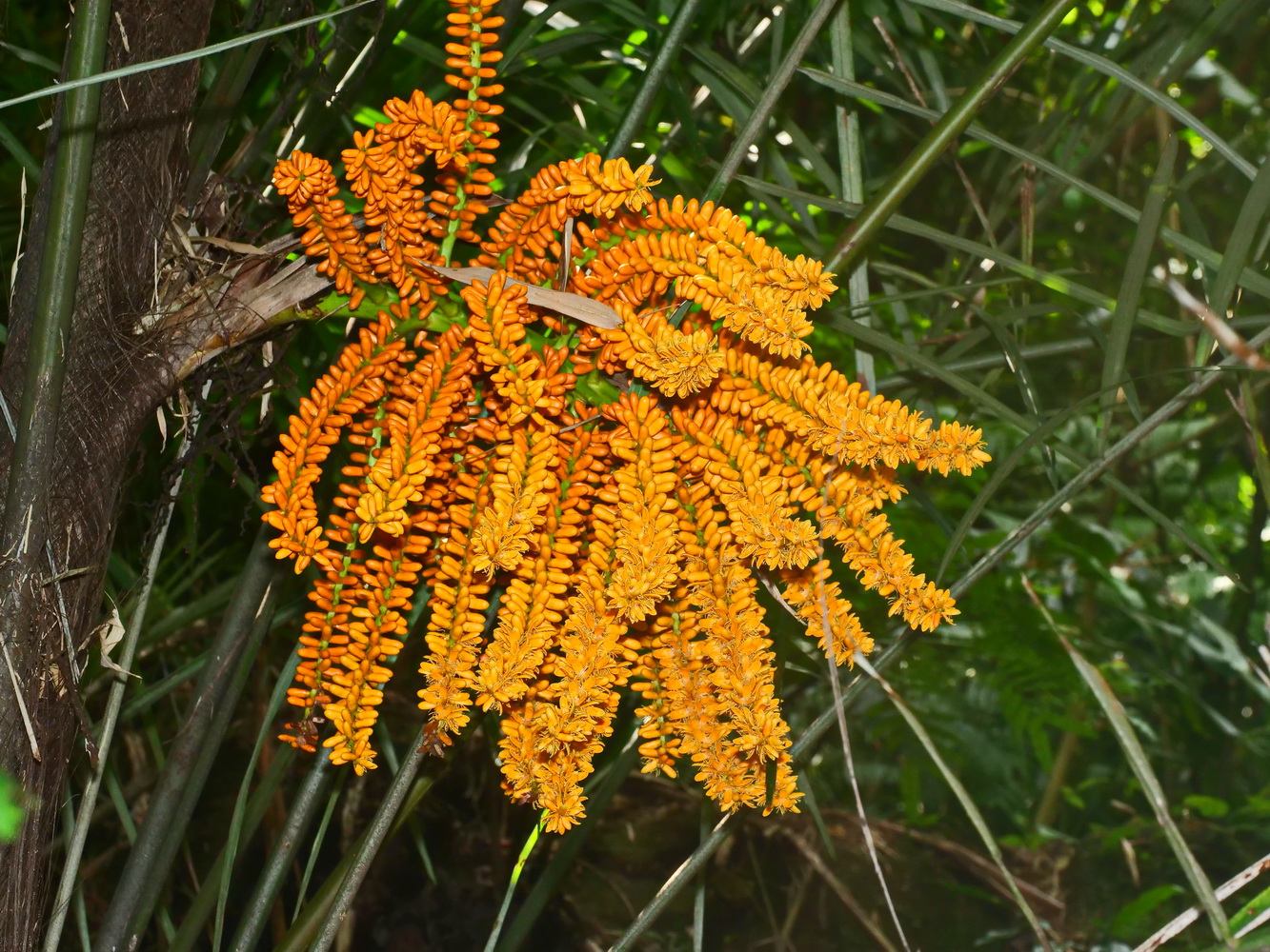 中研院院區和國家生技研究園區步道的山棕正在開花. 院區步道兩處的山棕,一處開出雌花,另一處開出了雄花.
