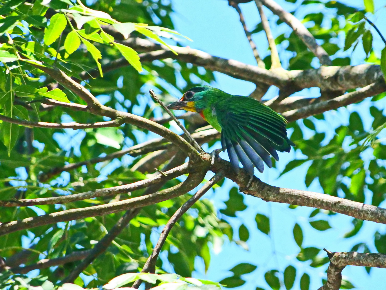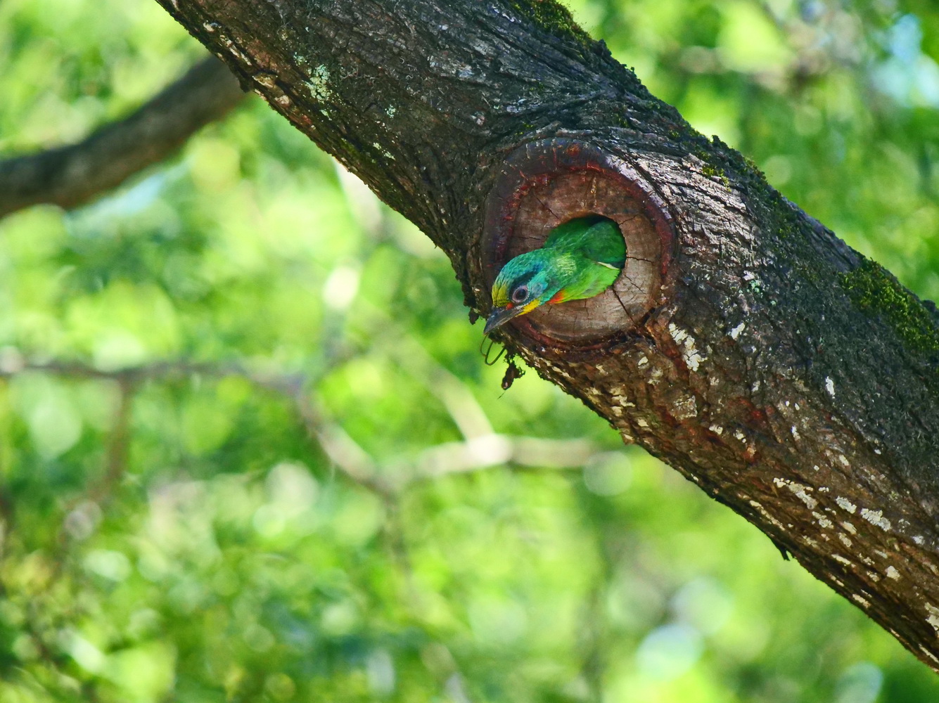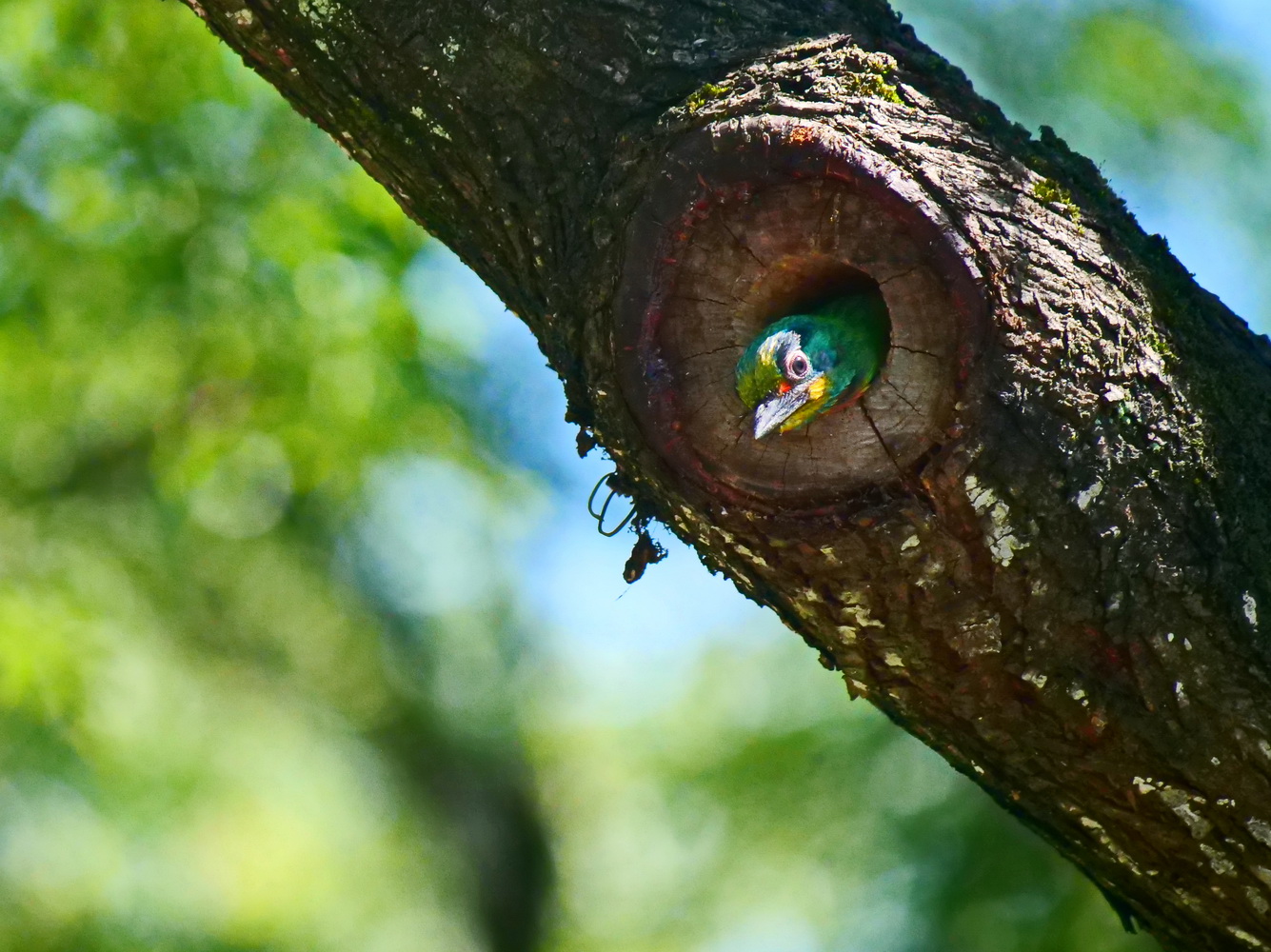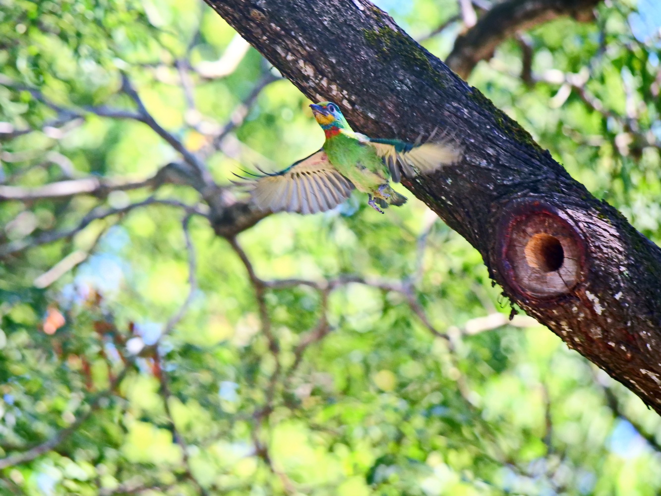 早上,天氣晴朗炎熱,是五色鳥幼仔離巢初次飛行的好日子,數支長焦大砲已架設多時. 只見那幼鳥在巢洞口來回多次探頭,卻始終未展翅,急壞了停棲在高處枝頭的親鳥,不斷的輕叫催促. 許多鳥兒也聞訊而來,紛紛站在樹上觀禮. 家八哥飛到樹上賣力加油,紅嘴黑鵯是專程來看熱鬧,大捲尾小聲囔囔,似乎在說”趕快跳啊”. 幼鳥在眾鳥鼓勵下,終於鼓足勇氣,露出半個身體一飛衝天,所有人都措手不及,快門沒作動. 幼鳥初展飛羽,技巧生澀,暫停鄰近樹梢,似乎對生長的巢洞有所留戀,轉身看了一眼那狹小的洞口後,立即飛至較遠的樹上,牠初次享受那海闊天空的自由,毫無拘束的伸展著翅膀,清理喉嚨,熟練嘴啄之力,整順尾羽, 隨即飛進園區的山坡密林.