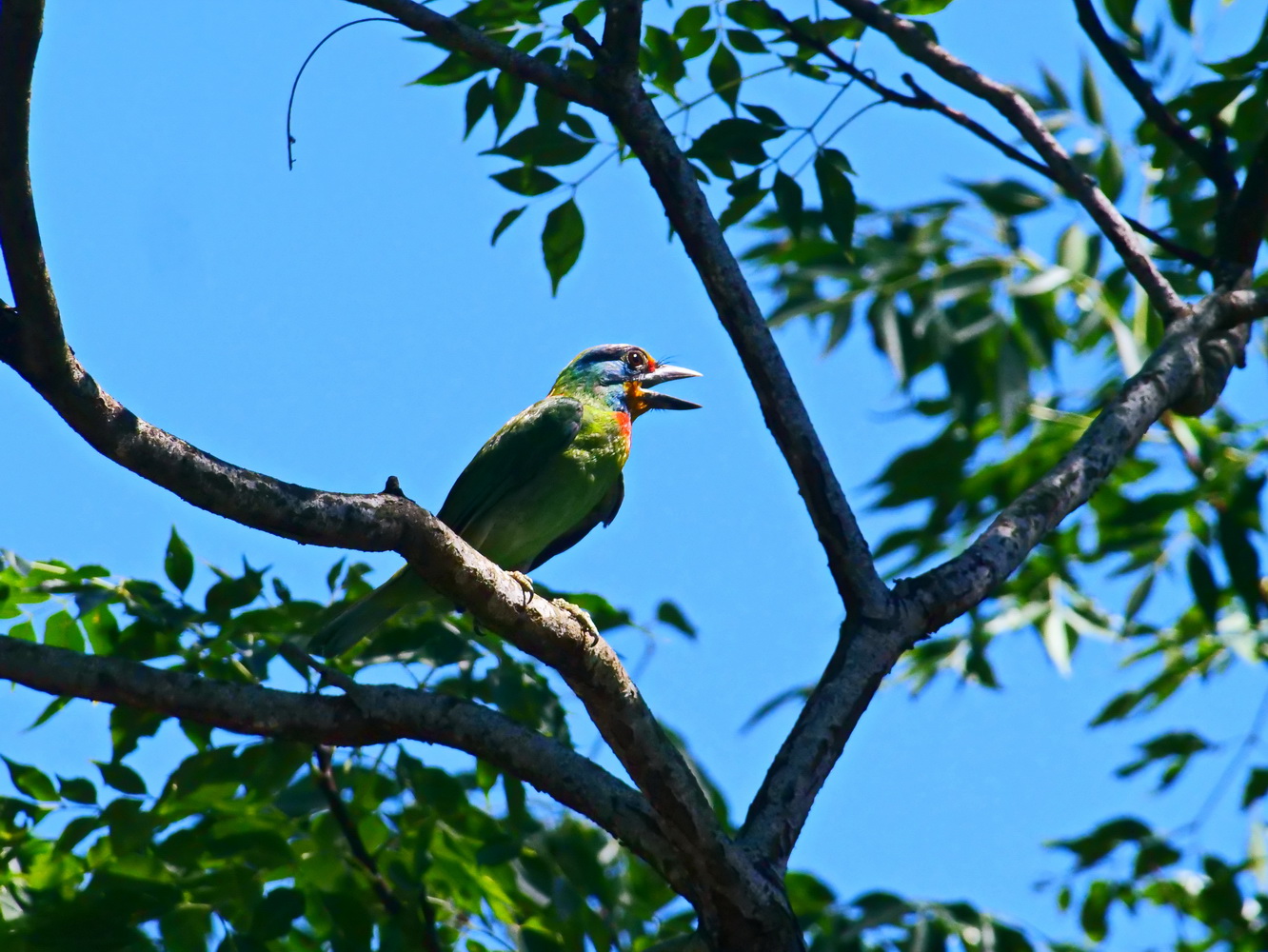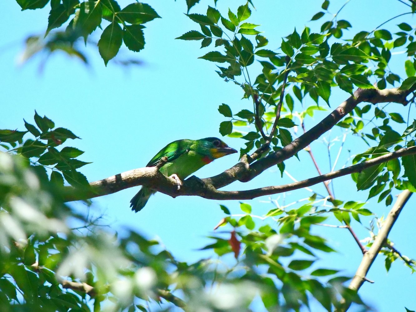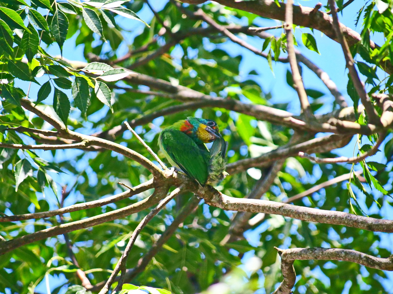 早上,天氣晴朗炎熱,是五色鳥幼仔離巢初次飛行的好日子,數支長焦大砲已架設多時. 只見那幼鳥在巢洞口來回多次探頭,卻始終未展翅,急壞了停棲在高處枝頭的親鳥,不斷的輕叫催促. 許多鳥兒也聞訊而來,紛紛站在樹上觀禮. 家八哥飛到樹上賣力加油,紅嘴黑鵯是專程來看熱鬧,大捲尾小聲囔囔,似乎在說”趕快跳啊”. 幼鳥在眾鳥鼓勵下,終於鼓足勇氣,露出半個身體一飛衝天,所有人都措手不及,快門沒作動. 幼鳥初展飛羽,技巧生澀,暫停鄰近樹梢,似乎對生長的巢洞有所留戀,轉身看了一眼那狹小的洞口後,立即飛至較遠的樹上,牠初次享受那海闊天空的自由,毫無拘束的伸展著翅膀,清理喉嚨,熟練嘴啄之力,整順尾羽, 隨即飛進園區的山坡密林.