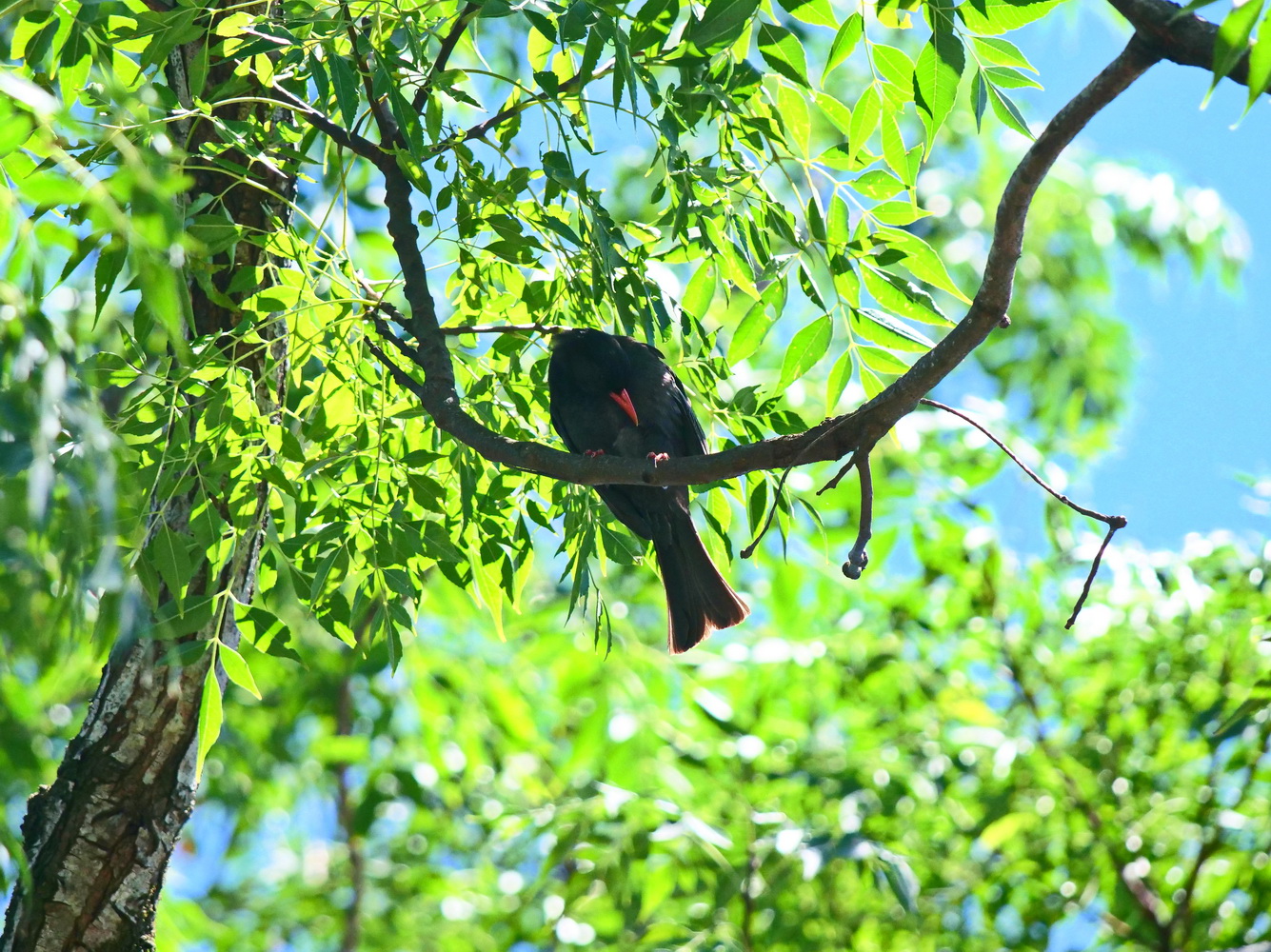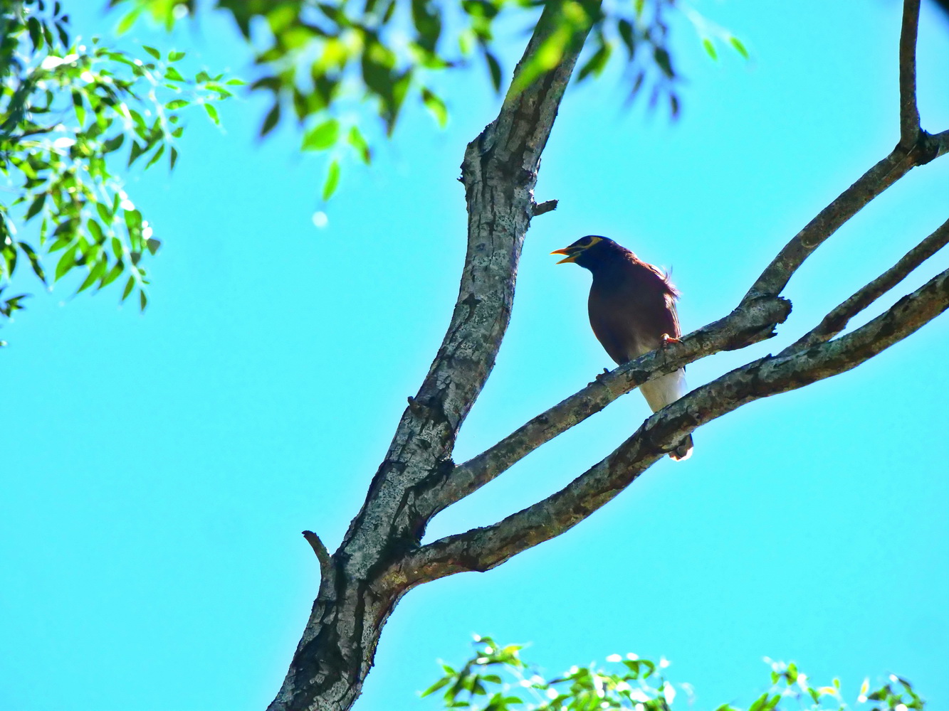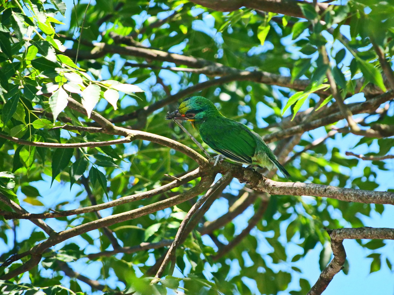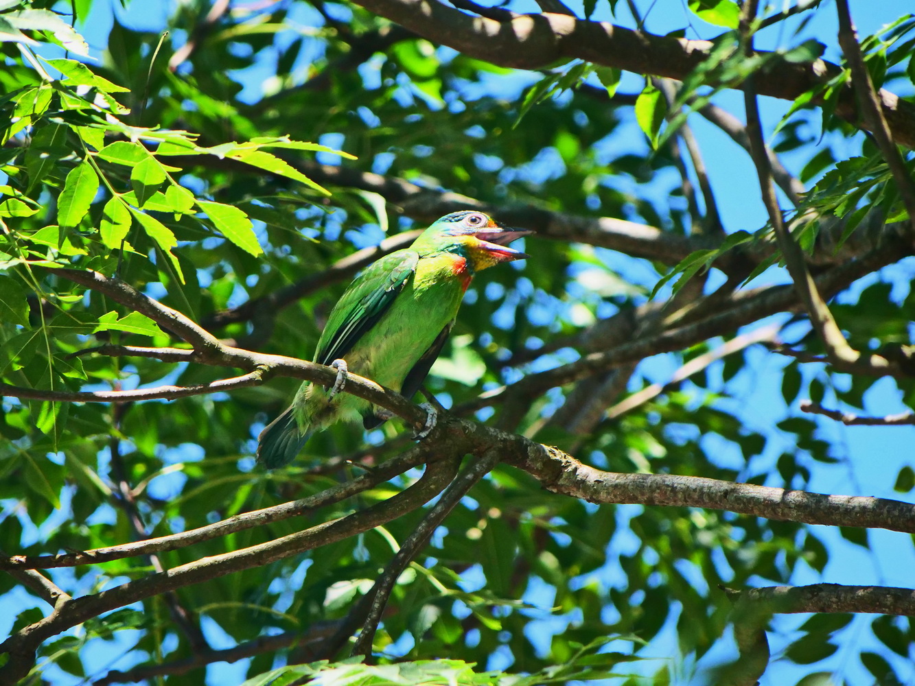 早上,天氣晴朗炎熱,是五色鳥幼仔離巢初次飛行的好日子,數支長焦大砲已架設多時. 只見那幼鳥在巢洞口來回多次探頭,卻始終未展翅,急壞了停棲在高處枝頭的親鳥,不斷的輕叫催促. 許多鳥兒也聞訊而來,紛紛站在樹上觀禮. 家八哥飛到樹上賣力加油,紅嘴黑鵯是專程來看熱鬧,大捲尾小聲囔囔,似乎在說”趕快跳啊”. 幼鳥在眾鳥鼓勵下,終於鼓足勇氣,露出半個身體一飛衝天,所有人都措手不及,快門沒作動. 幼鳥初展飛羽,技巧生澀,暫停鄰近樹梢,似乎對生長的巢洞有所留戀,轉身看了一眼那狹小的洞口後,立即飛至較遠的樹上,牠初次享受那海闊天空的自由,毫無拘束的伸展著翅膀,清理喉嚨,熟練嘴啄之力,整順尾羽, 隨即飛進園區的山坡密林.