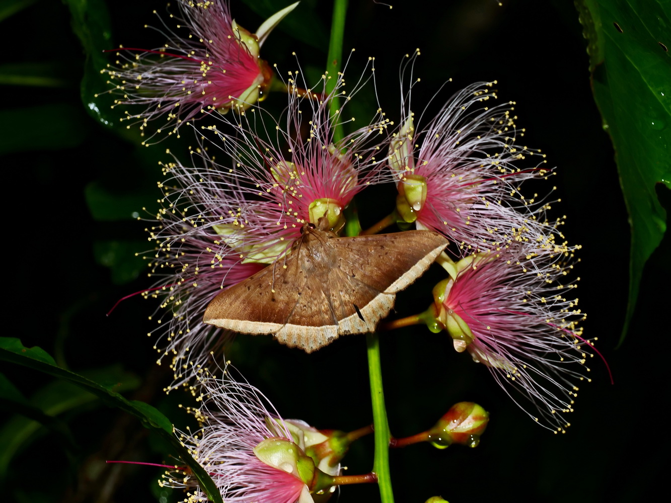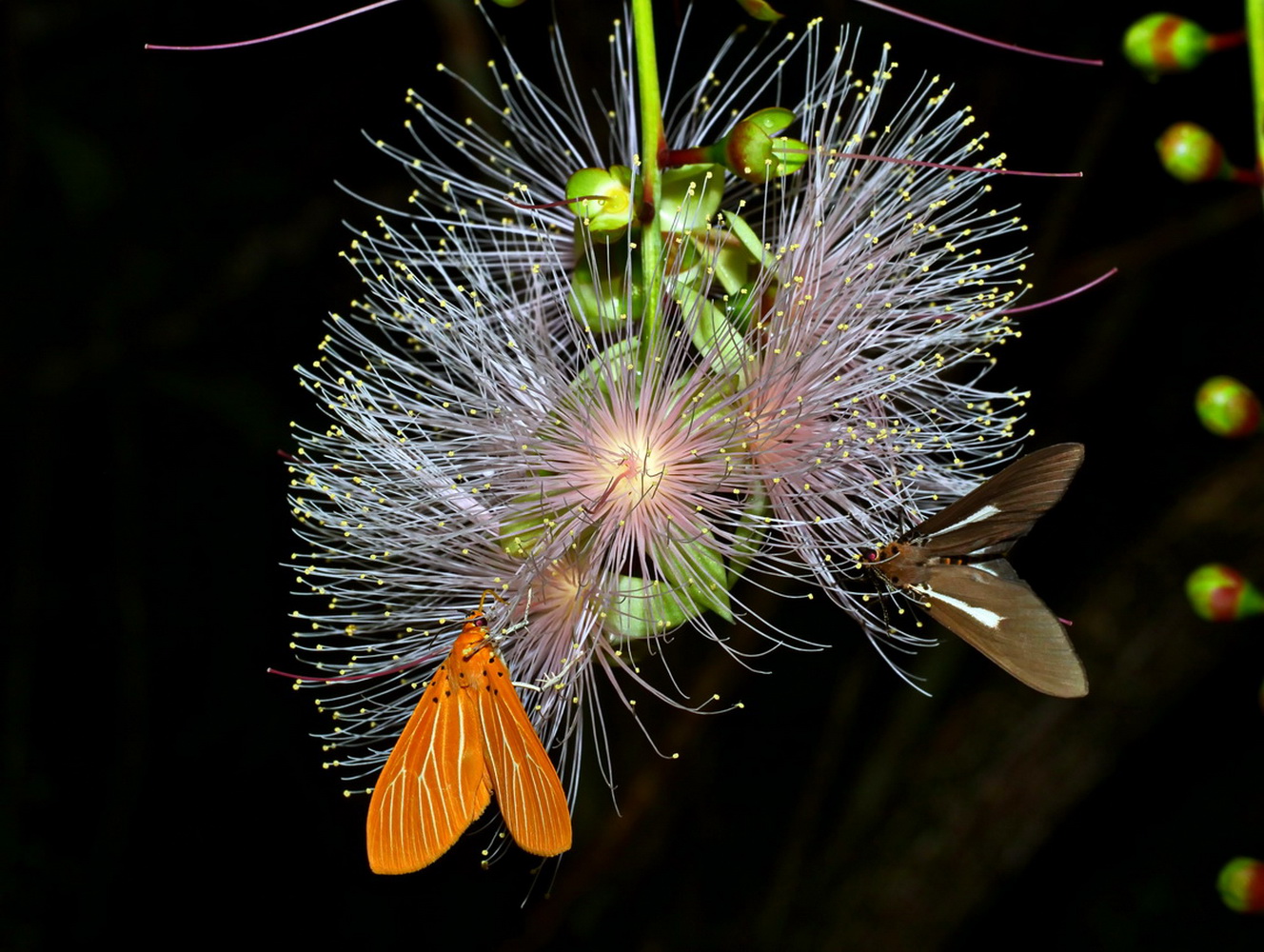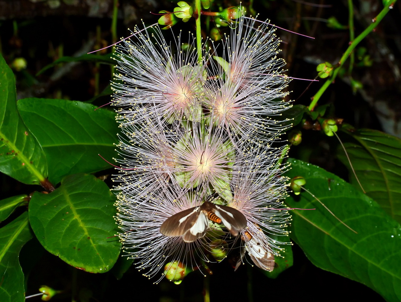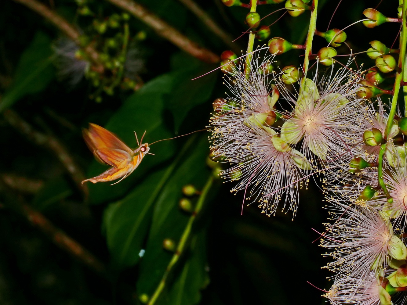 大雨過後的夜晚,院內生態池的穗花棋盤腳盛開,園區東北角濕地更是大爆發. 花序上大而亮麗的花朵散發出濃郁的香味,許多昆蟲前仆後繼聞香而來都是為了花蜜. 天蛾,鼓動雙翅遠離花蕊,牠狡猾的避過花絲吸取花蜜,連一粒花粉也沒沾上. 小蛾都是穿過了眾多的花絲,身上沾上不少的花粉,才能到達花心吸食一口蜜液. 中型蛾類就乾脆撲上去, 直接上演飛蛾撲火的戲碼.