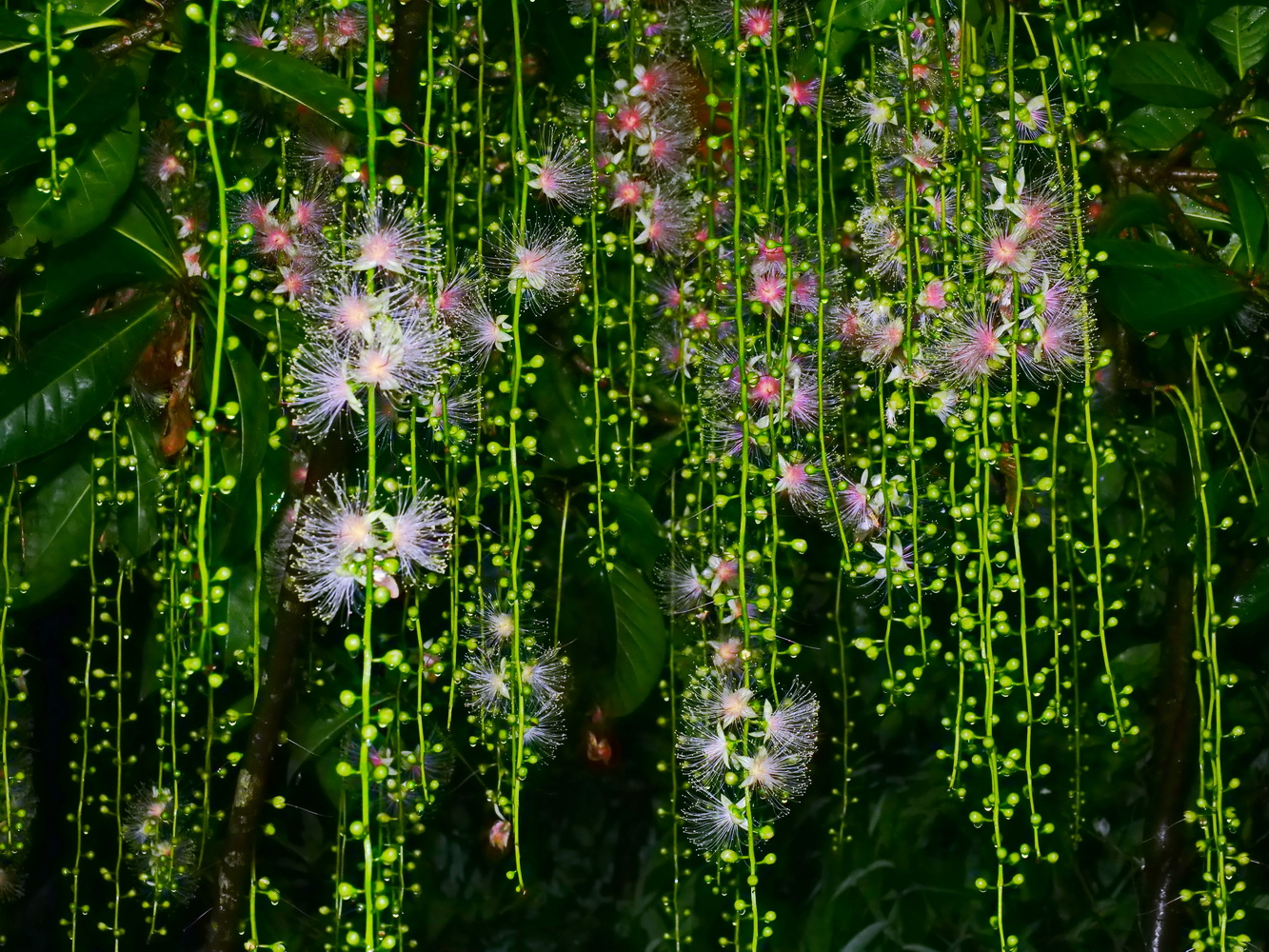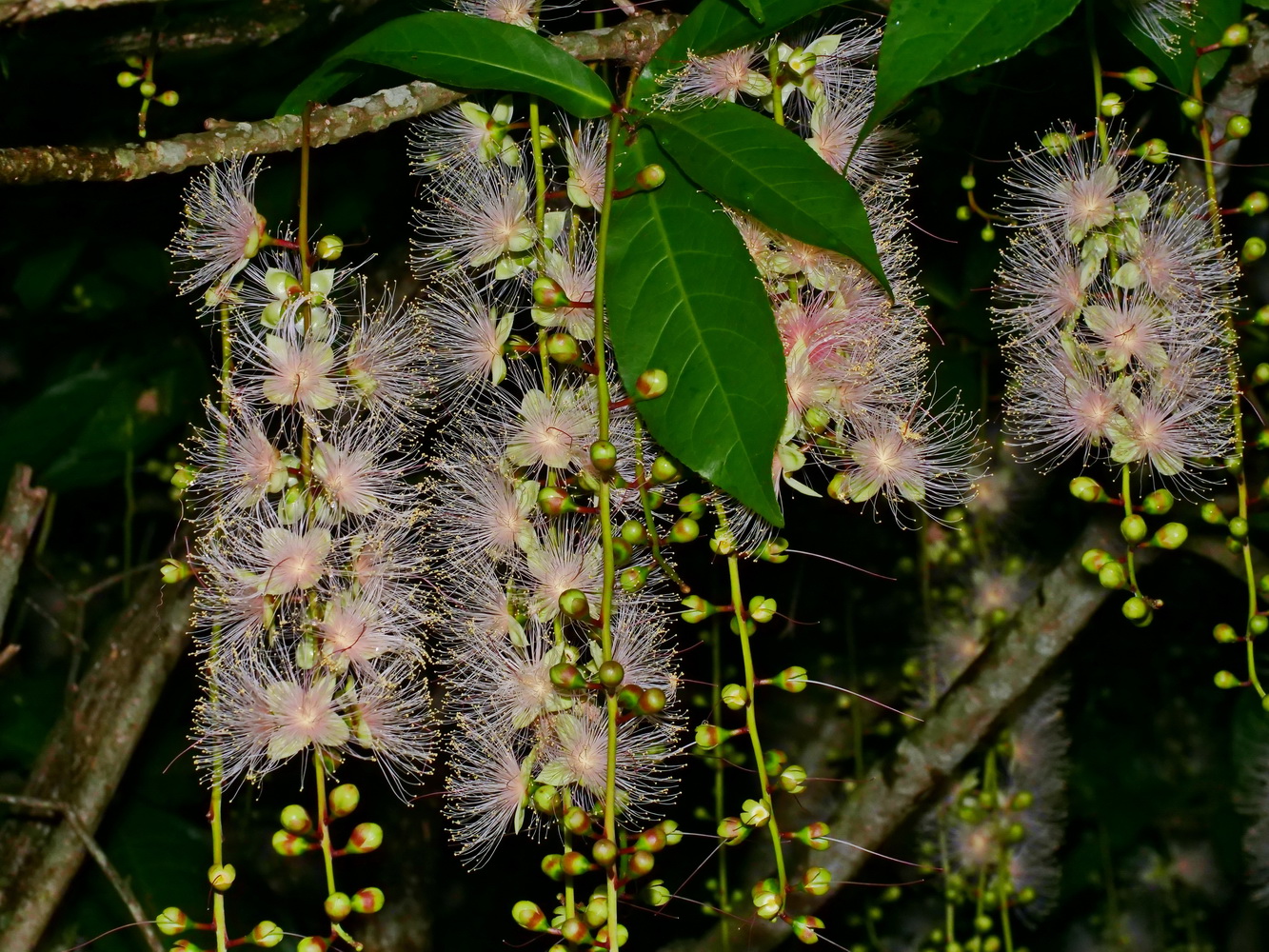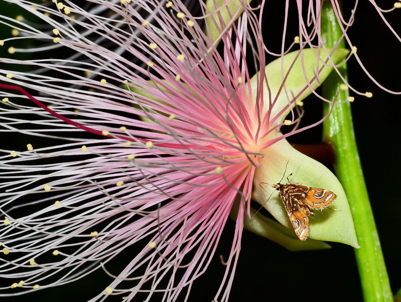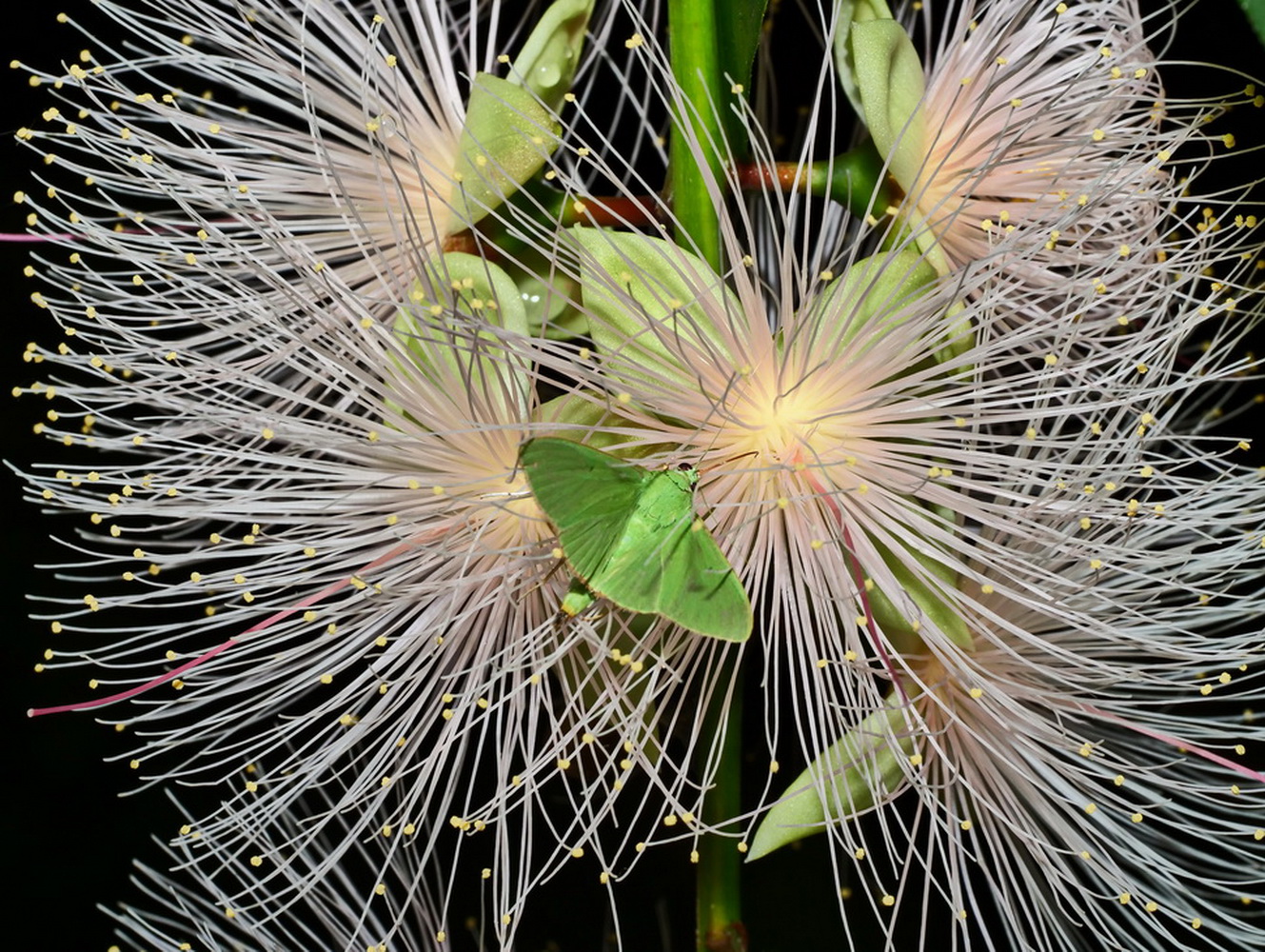 大雨過後的夜晚,院內生態池的穗花棋盤腳盛開,園區東北角濕地更是大爆發. 花序上大而亮麗的花朵散發出濃郁的香味,許多昆蟲前仆後繼聞香而來都是為了花蜜. 天蛾,鼓動雙翅遠離花蕊,牠狡猾的避過花絲吸取花蜜,連一粒花粉也沒沾上. 小蛾都是穿過了眾多的花絲,身上沾上不少的花粉,才能到達花心吸食一口蜜液. 中型蛾類就乾脆撲上去, 直接上演飛蛾撲火的戲碼.