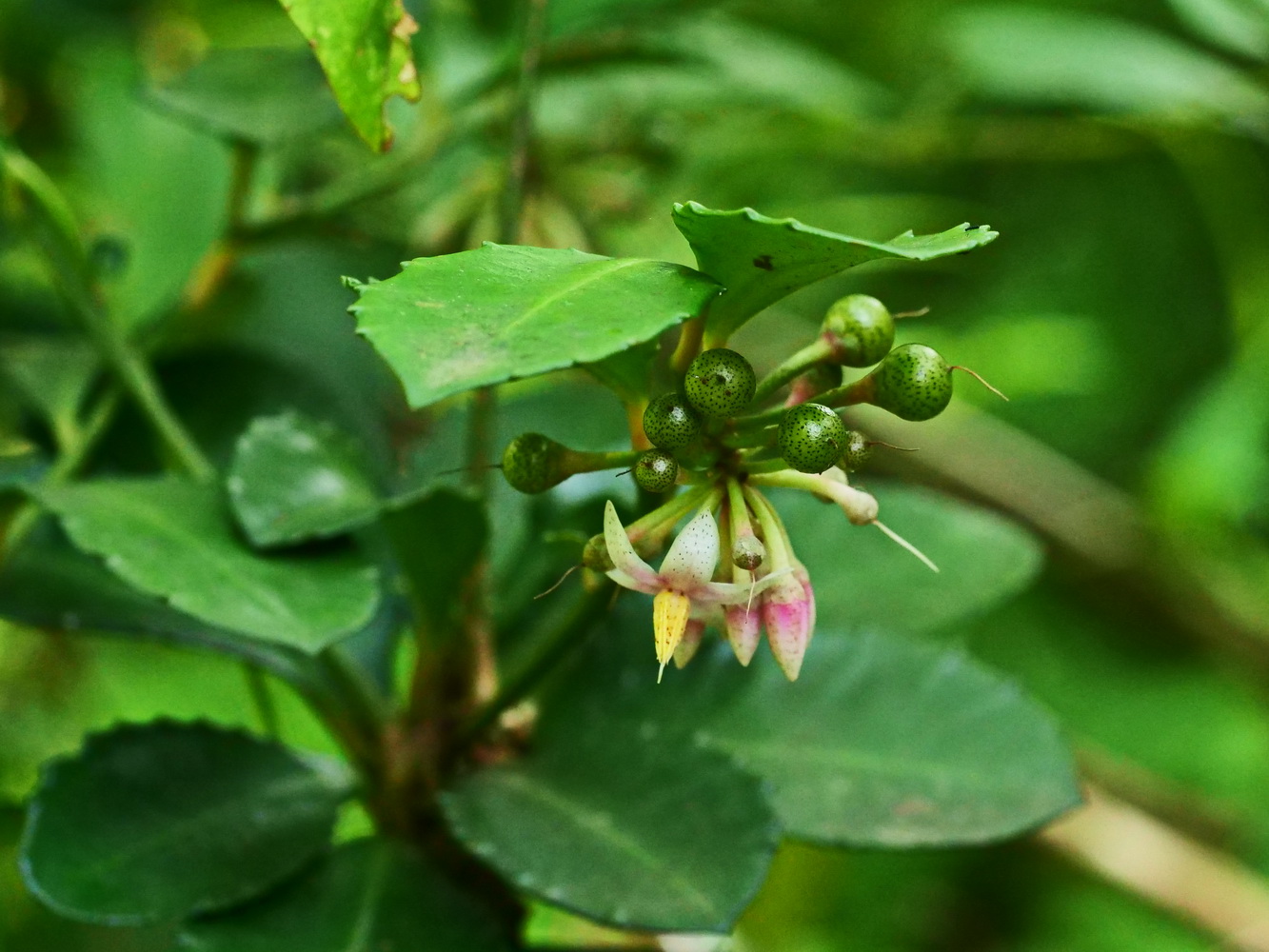 雨傘仔, 台灣特有種小灌木,過去的分類系統將它分到紫金牛科,新的系統則歸入報春花科.外表像紫金牛科的硃砂根,讓人很難聯想到是報春花科. 小枝光滑,葉革質,倒卵形,獨特的鋸齒狀齒緣,花果被深色腺點,熟果鮮紅色.