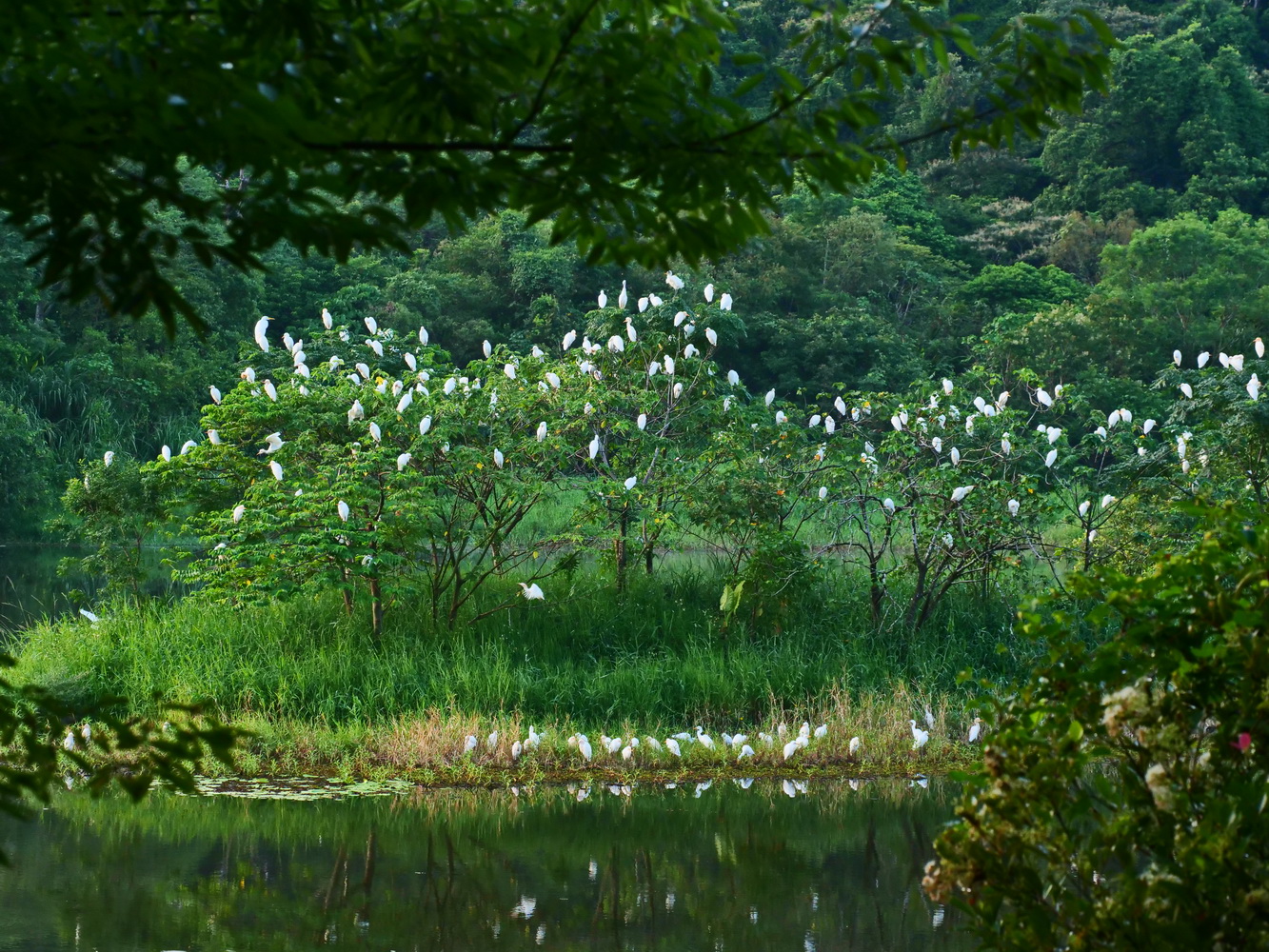 太陽雖已西沉,仍有黃頭鷺棲息池中島 |
