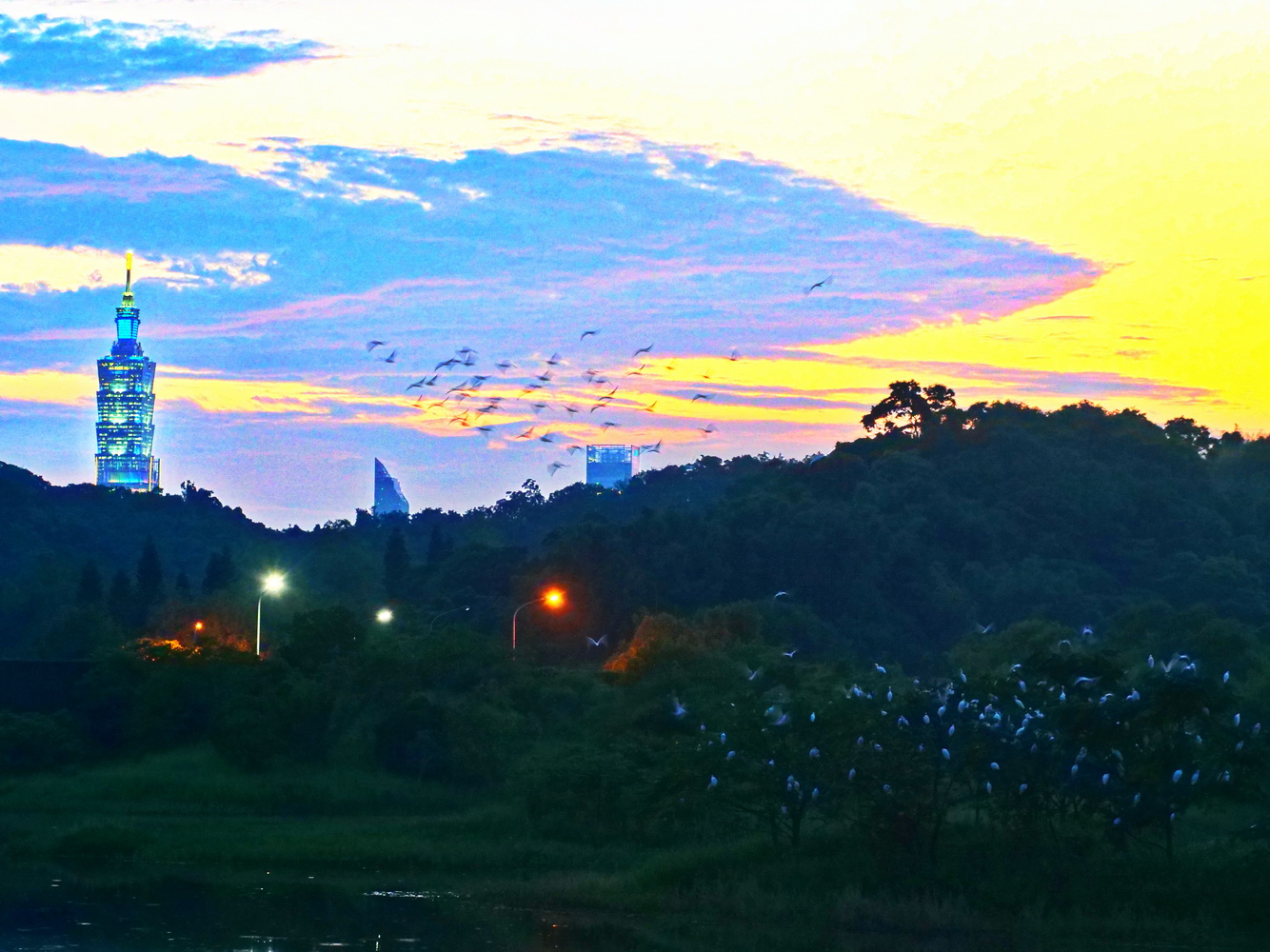 九月的夜調正好碰上黃頭鷺過境. 太陽已沉入地平線,高樓燈光在晚霞餘暉中閃爍,停棲於滯洪池內短暫休息的白鷺紛紛展翅飛向天際. 生態調查在晚霞過後,天色完全變暗才接著展開.