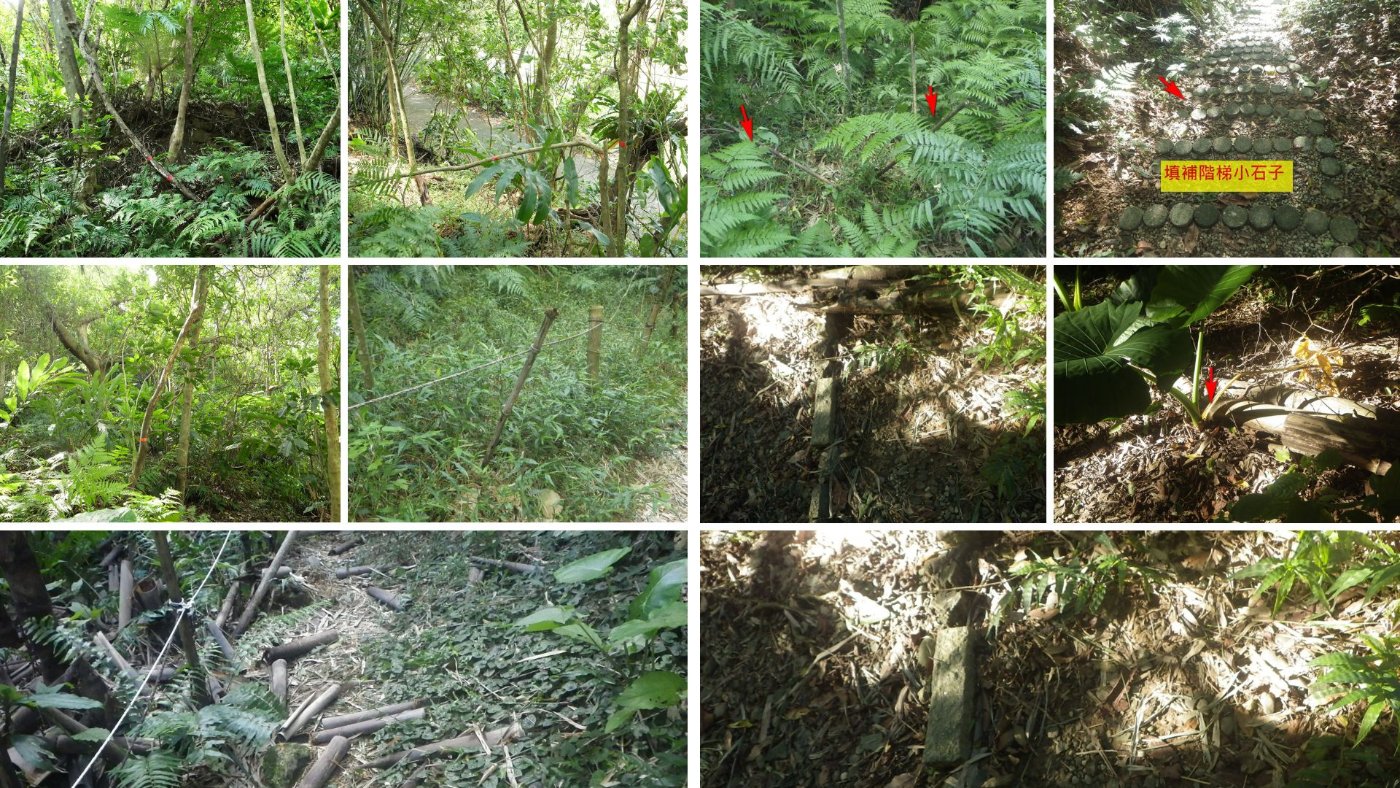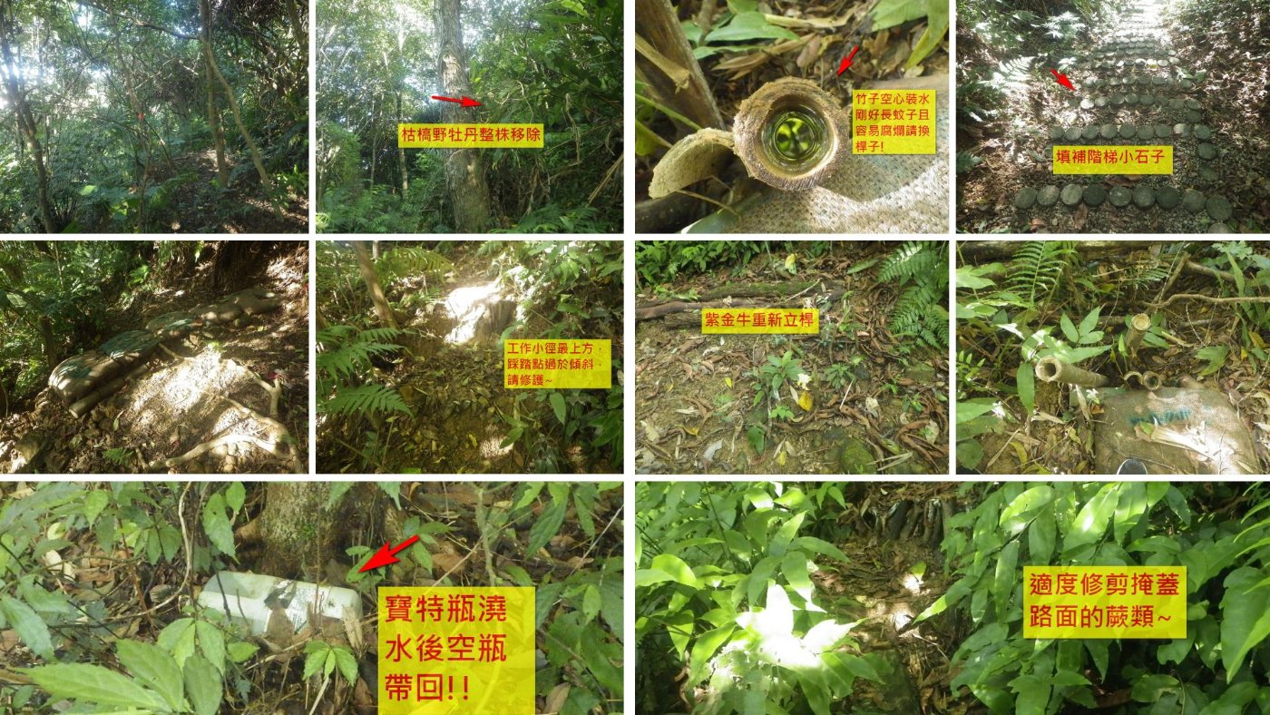 第二區維修工作便道,清除南北側工作小徑截水溝枯枝落葉,烏臼樹下枯槁的野牡丹請整株移除,請檢視水泥柱階梯用小石子填補凹陷處,工作小徑上有枯枝需要清除,立樁的竹子若不是節理的位置,剛好接雨水容易產生蚊子,且容易腐爛清更換~紫金牛小苗請重新立桿! 有寶特瓶的地方請幫植物澆水,空瓶帶回~工作小徑最上方,踏點過於傾斜請製作一個L型踏階,比較安全!!