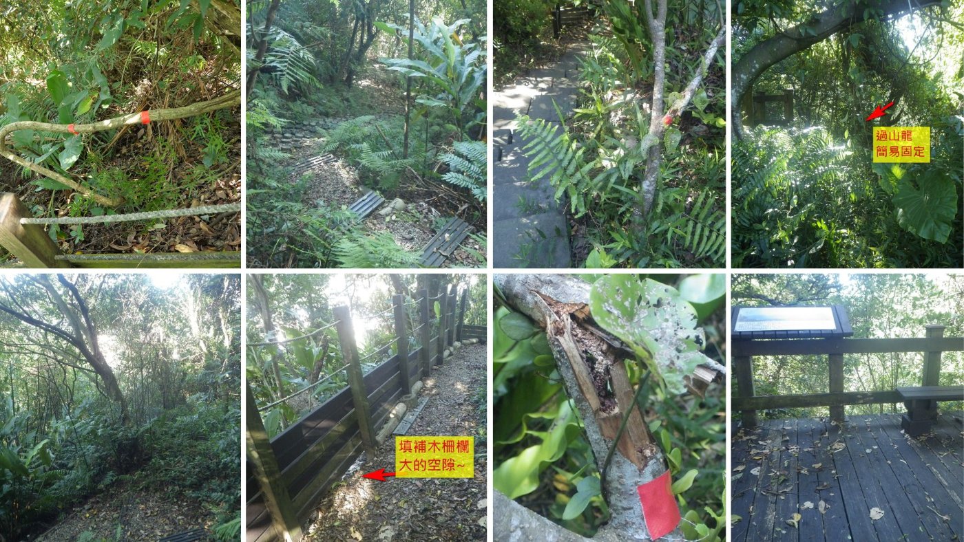 第三區清掃整區落葉,石階步道近紅楠大樹對面路旁的酸藤請修剪並帶回志工作為開放日展示使用, 並在安全無慮的條件下清除天料木鄰近的酸藤,請以安全優先清除~楊梅樹上方有一株樹木分岔枝斷裂有腐朽的情況,請用三刀式用鋸子修剪~紅楠樹下的平台木柵欄已經修好,請拿山龍眼樹旁長的水泥柱填補大的空隙,避免小石子繼續掉落~清掃世仁亭枯枝落葉,簡易固定過山龍藤蔓。
