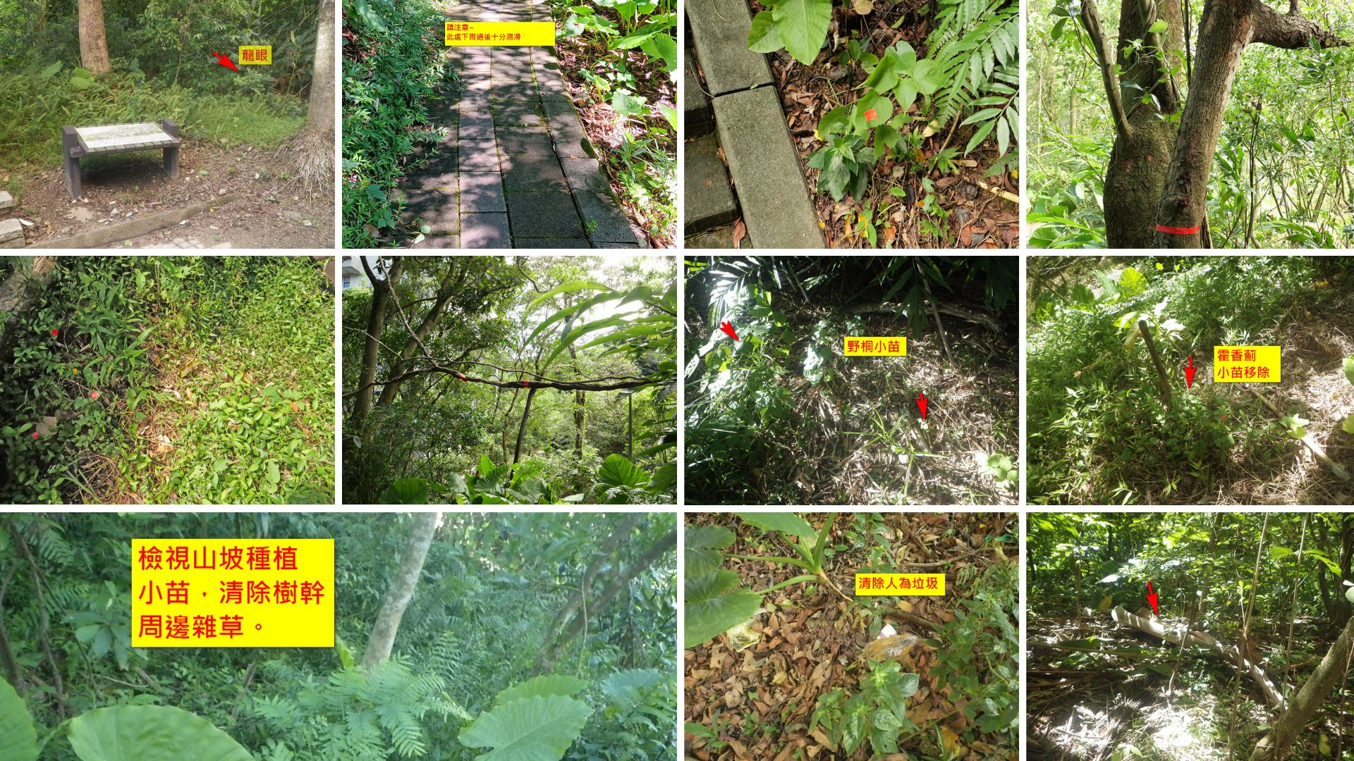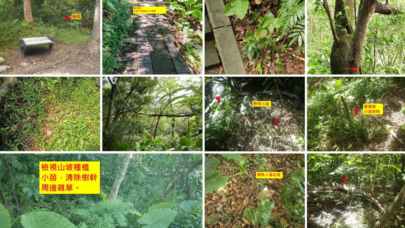 第一區檢查清除坡地的斷枝枯樹,清除截水溝枯枝落葉,姑婆芋枯葉請從底部修剪,工作小徑立桿腐朽請更新,竹籜掉滿地,請收集起來推放在樹下當肥料,避免行走時絆倒。枯死小苗立桿的地方請將桿子整理堆放在樹下~有部分石階路面泥土裸露,請填補階梯小石子。有寶特瓶的地方請幫植物澆水,空瓶帶回~