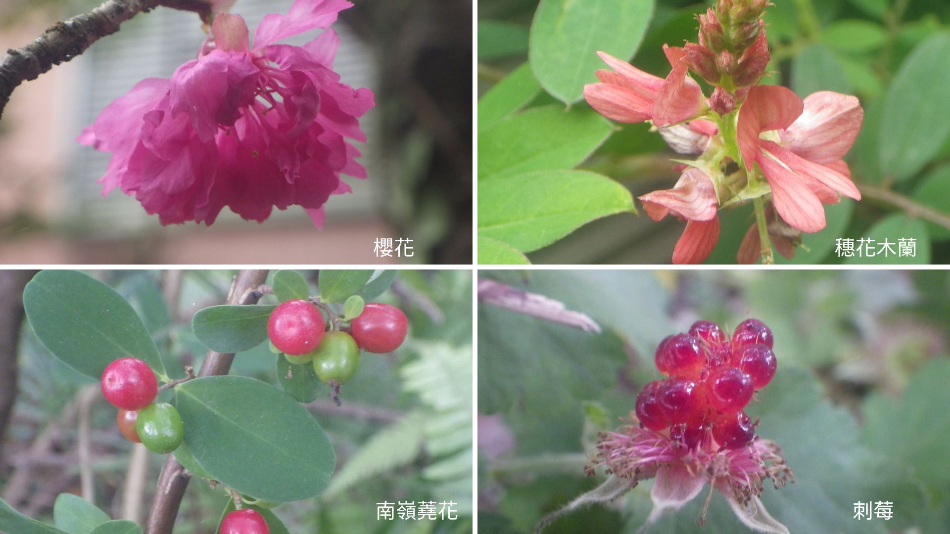 目前穗花木蘭、刺莓、竹葉蘭、正在盛開,南嶺蕘花結的果實,櫻花只有一朵可以觀賞喔~