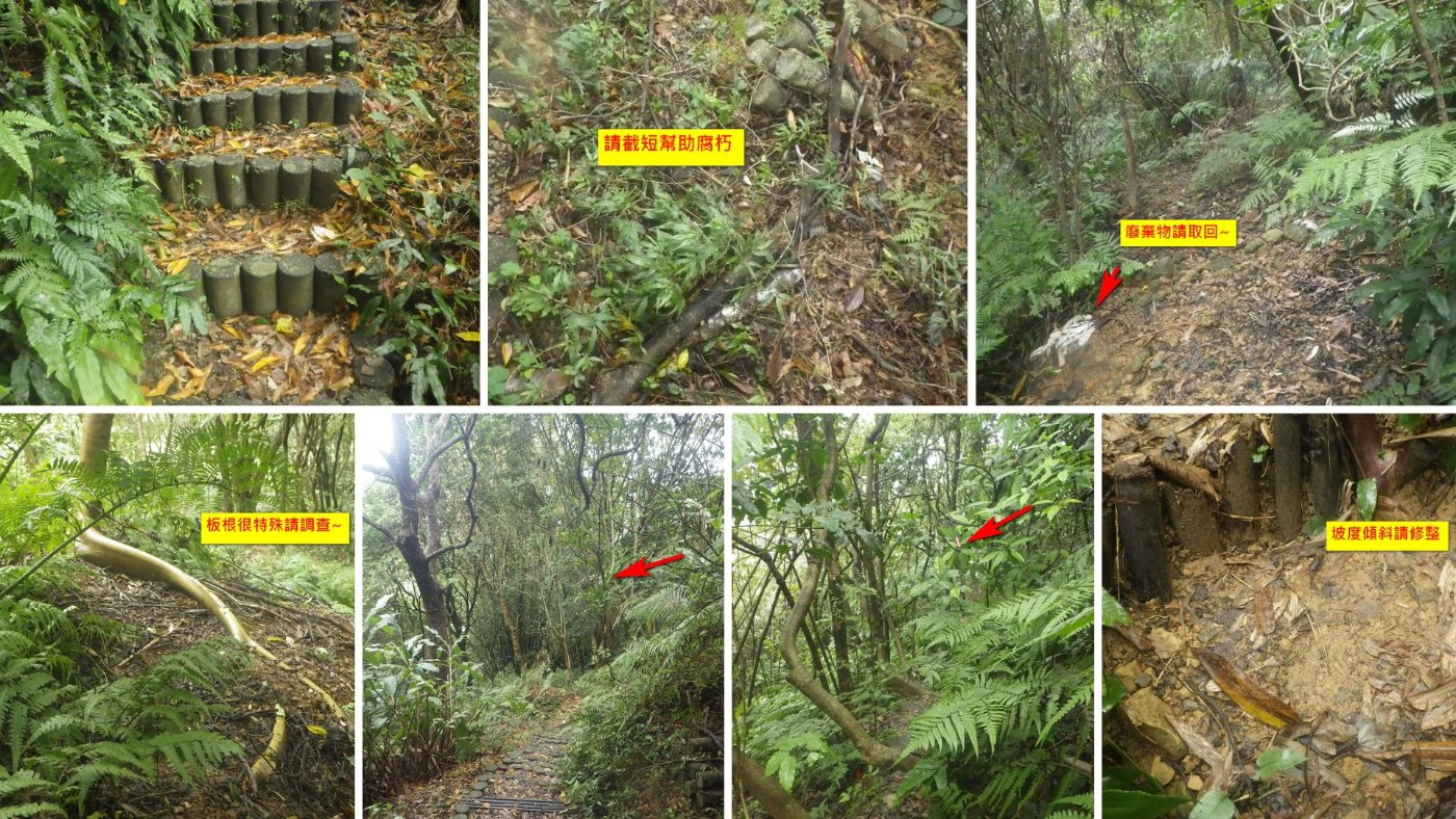 第三區的世仁亭地板要刷洗。牛嬭菜的圈圍請重新綁好,避免被誤砍!!步道支線製作的泥土階梯間距踏點過短,請增加長度~步道階梯凹陷處請補充小石子~枯枝懸掛請拿長勾拉下來,避免突然掉落砸到民眾! 山龍眼枝條斷裂請修剪~