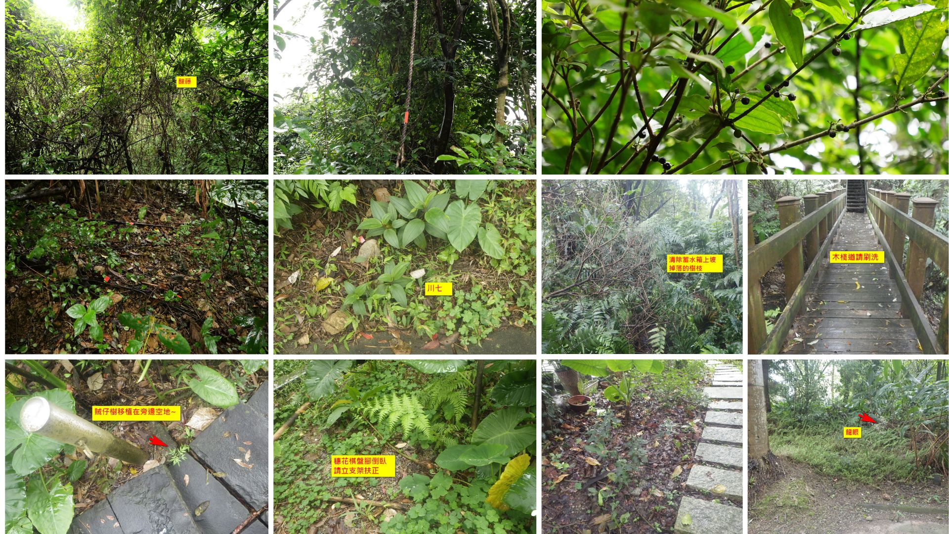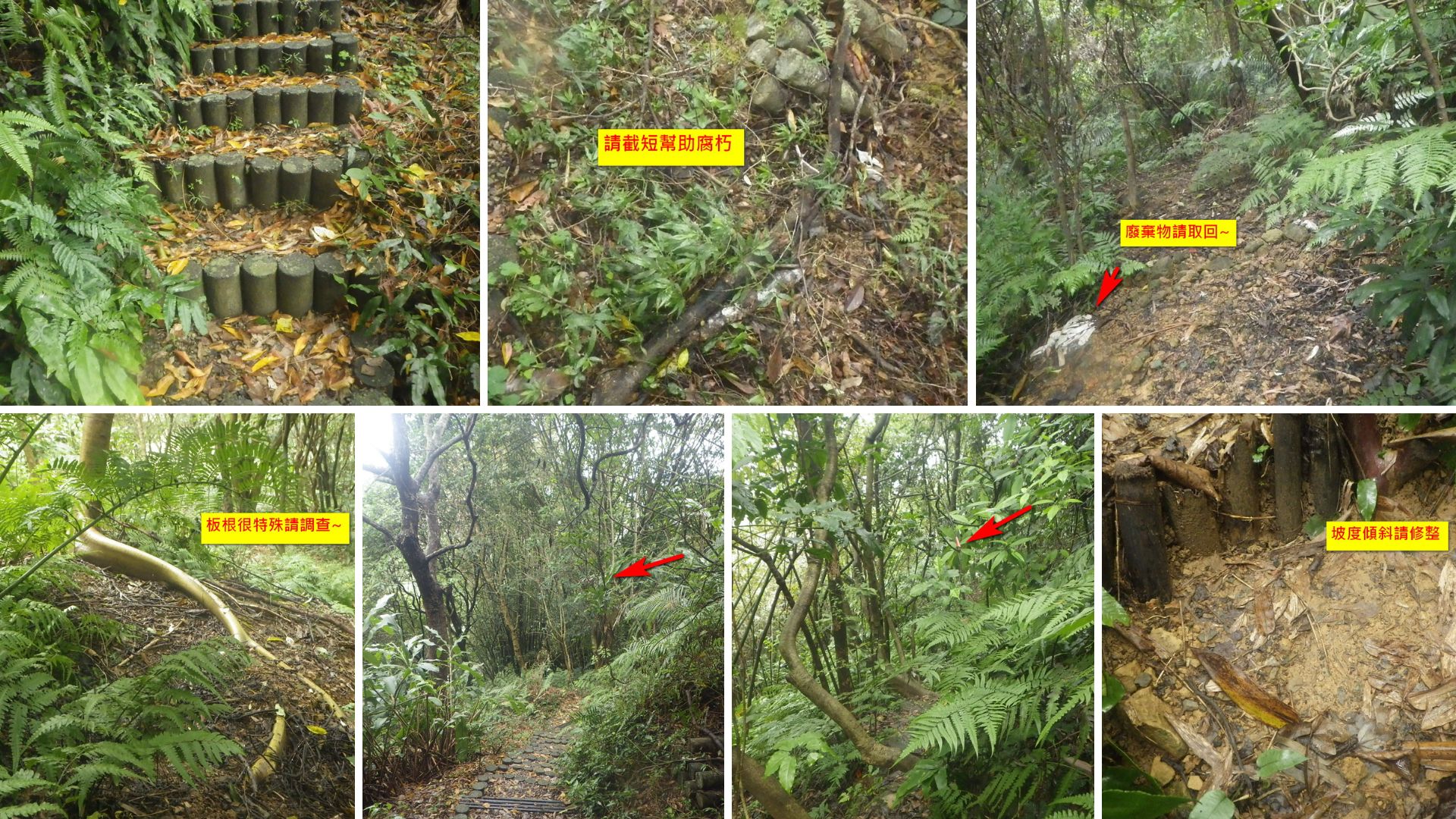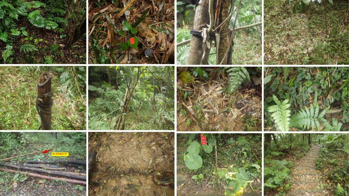 第一區清除牽牛花和陽性植物如野桐小苗,清除世仁亭下枯枝和擋步道的酸藤,步道平台的硃砂根請立樁保護! 上個月已經提醒大錦蘭纏繞的小樹已經腐朽,請重新固定避免倒塌~西側步道口有人為砍伐姑婆芋,請將斷掉的塊莖,插在上坡的泥土裡~雞屎樹掉落的果實,請按壓在泥土裡幫助生長! 枯槁的梵天花請移除~ 麻繩斷裂的地方請重新綁好~清掃步道枯枝落葉!