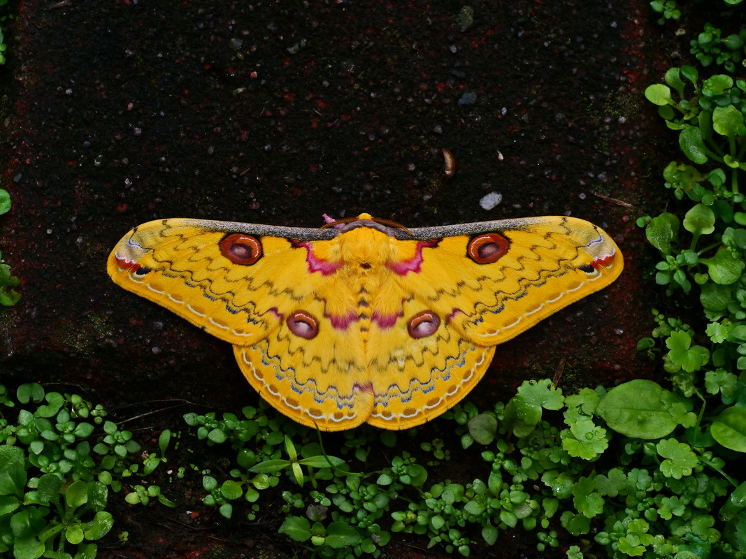 院區的黃豹天蠶蛾(特有種)已連續數年出現在同一區域,只要到了十月總是會來報到。牠的翅面透露出帝王般的鮮黃色彩,搭配上四個擬眼紋,亮麗的顏色加上翅面紋路圖案,不吸睛也難。